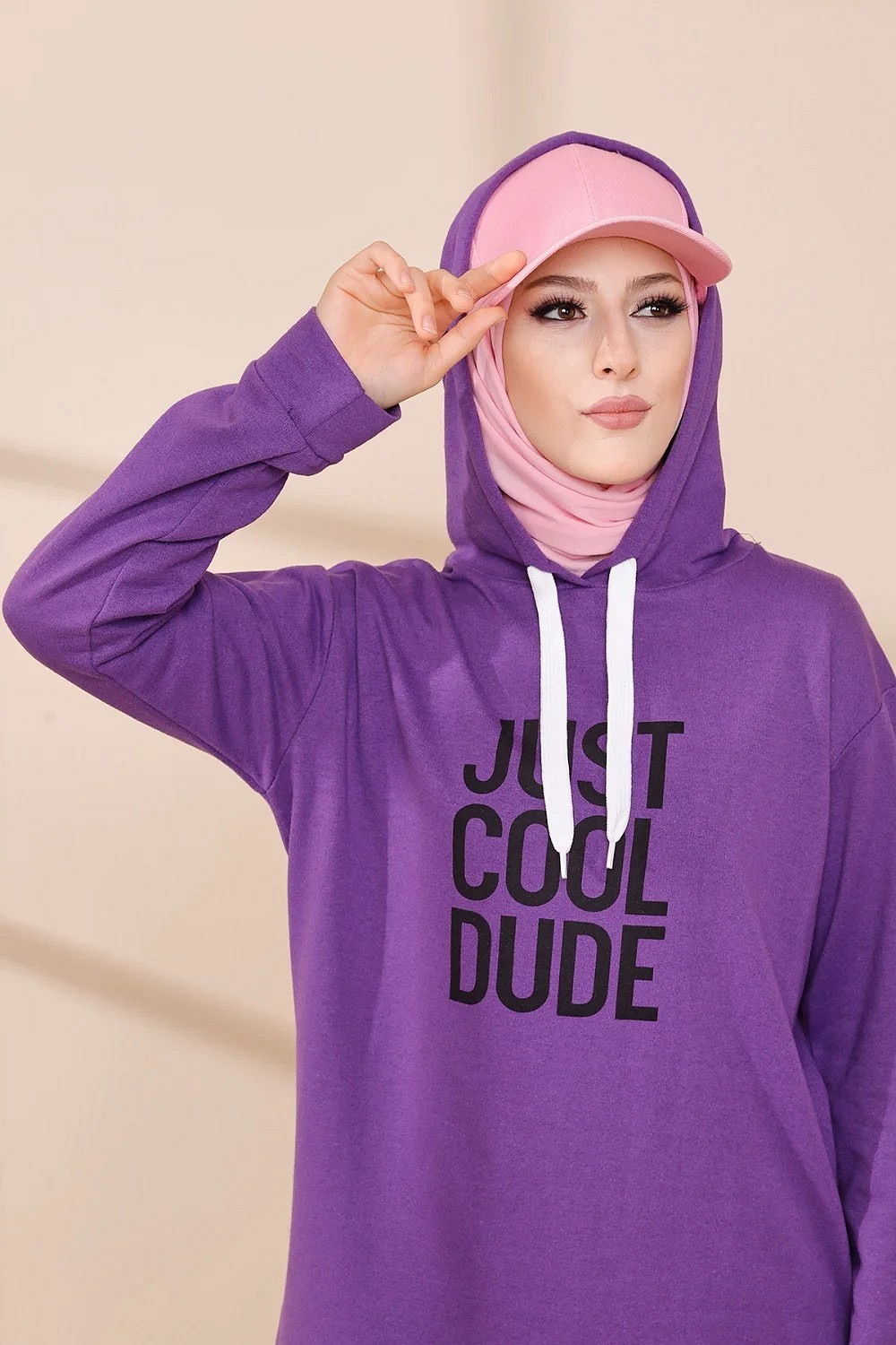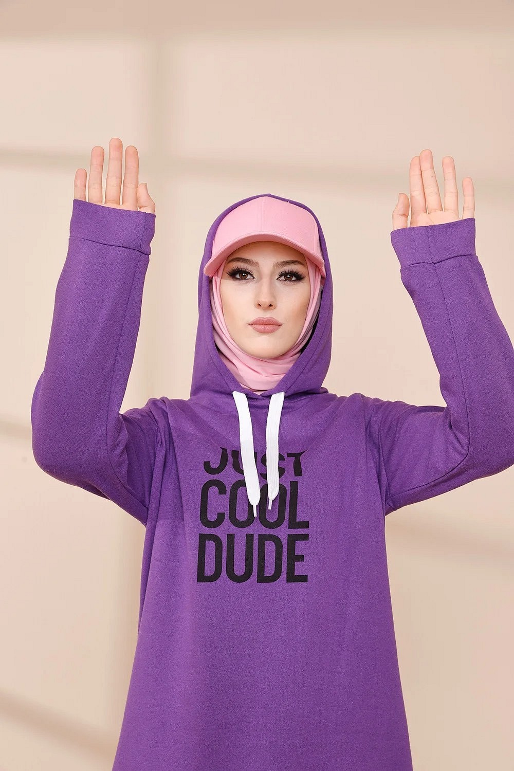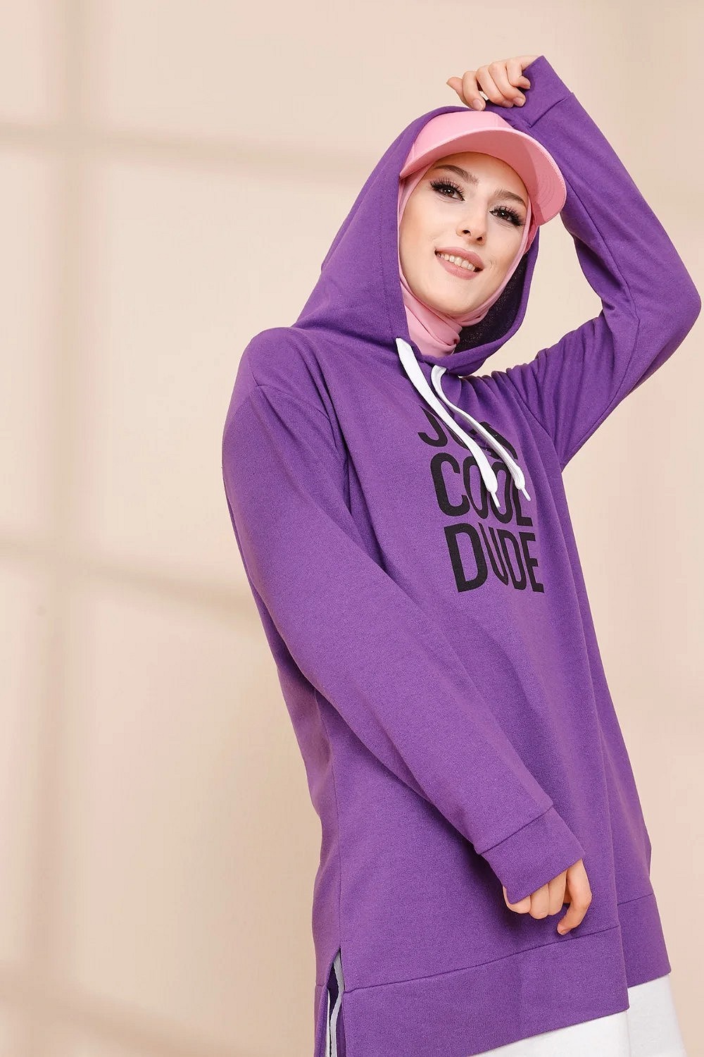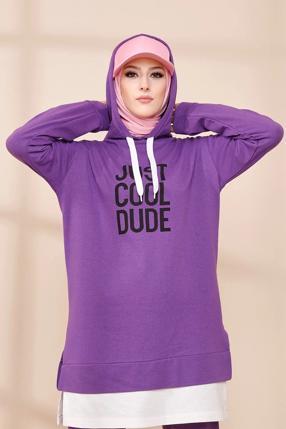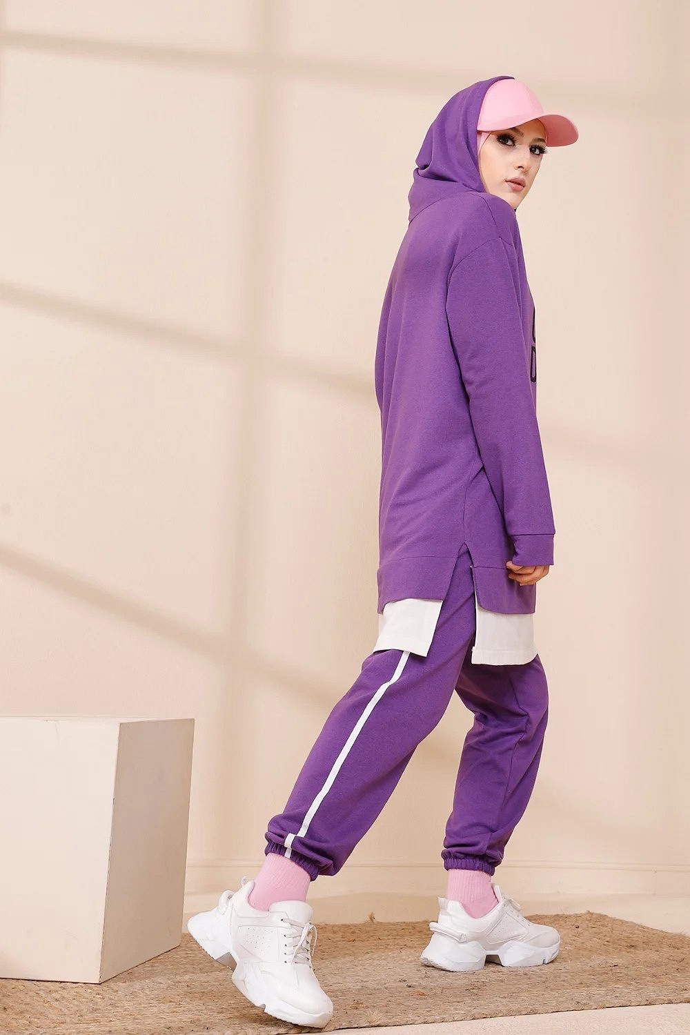 Survetement decontracte avec extension blanche - Sweat a capuche imprime et pantalon (Boutique de vetement pour femme voilee) - Couleur violet