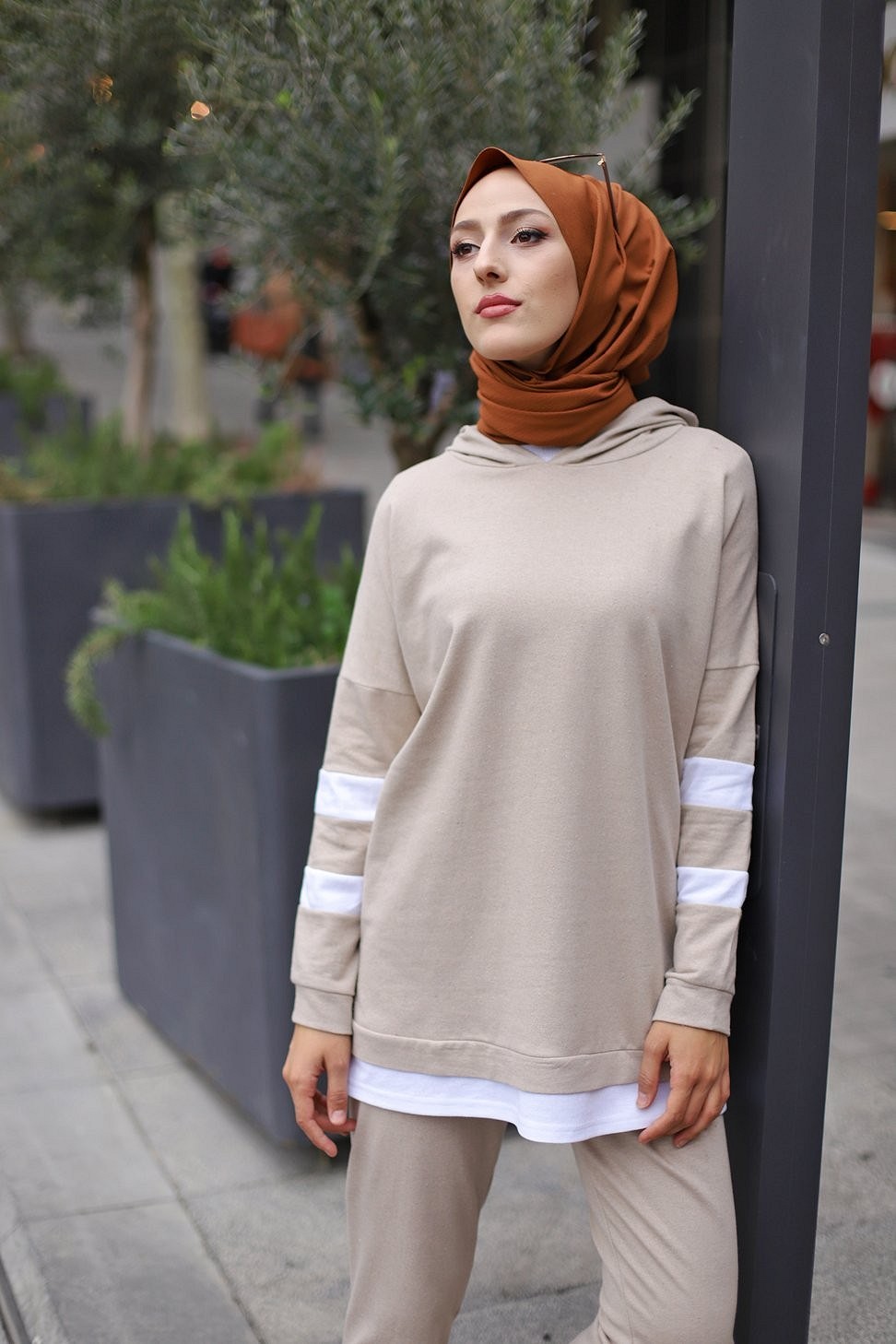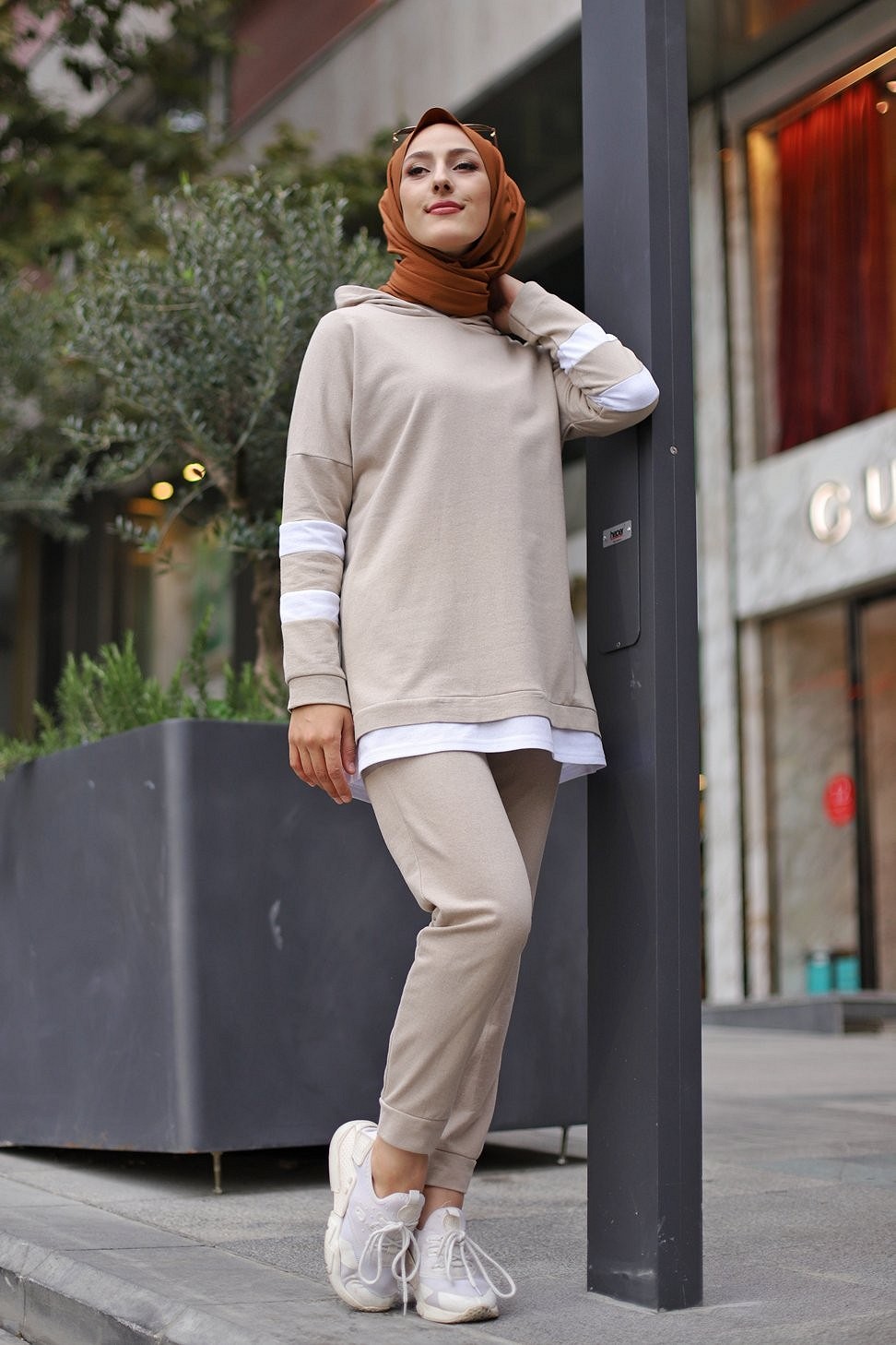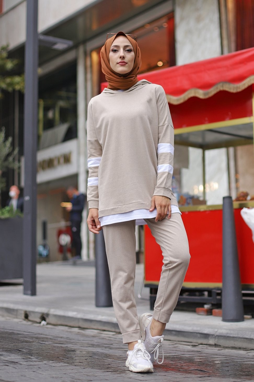 Ensemble survêtement 2 pièces (Haut à capuche et bas et jogger) pour femme voilée - Couleur blanc et Camel - REF. 32948 (28.00 €)