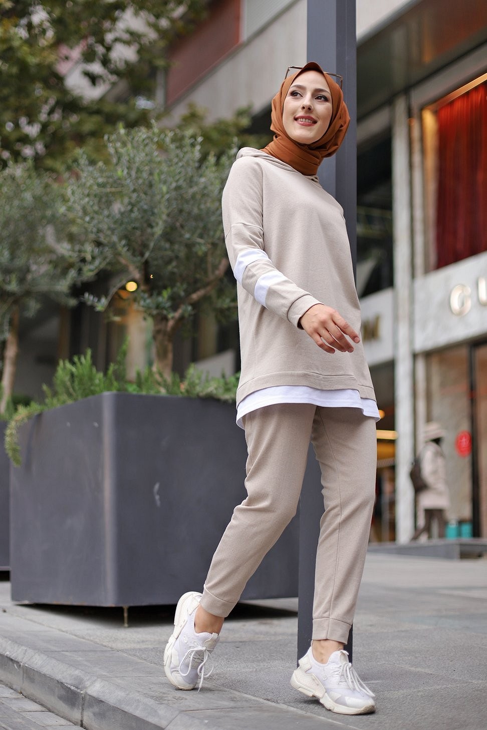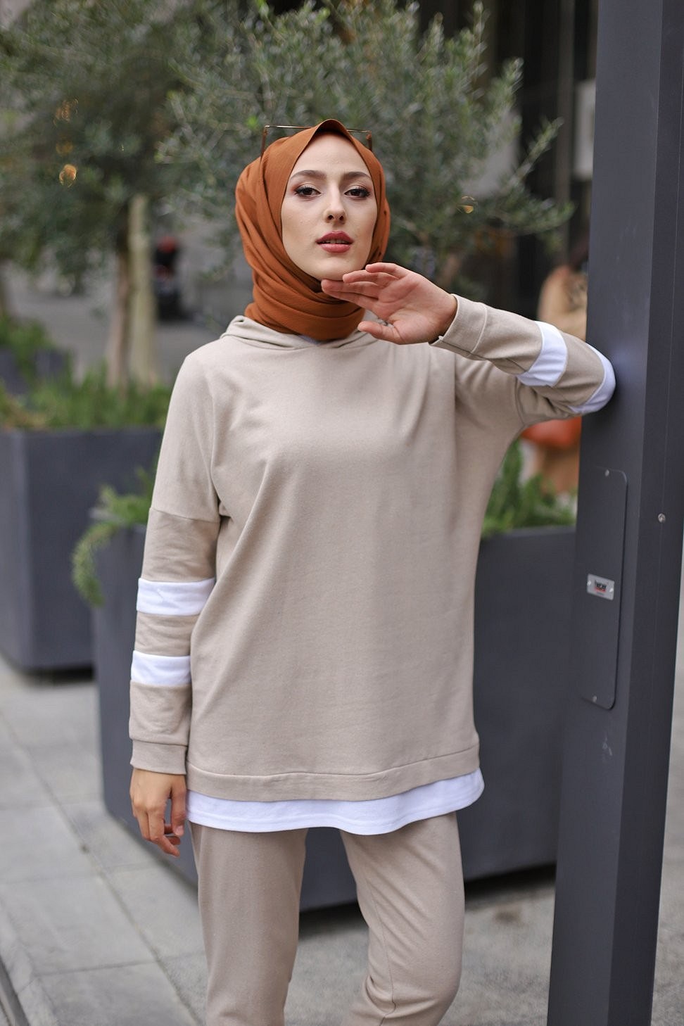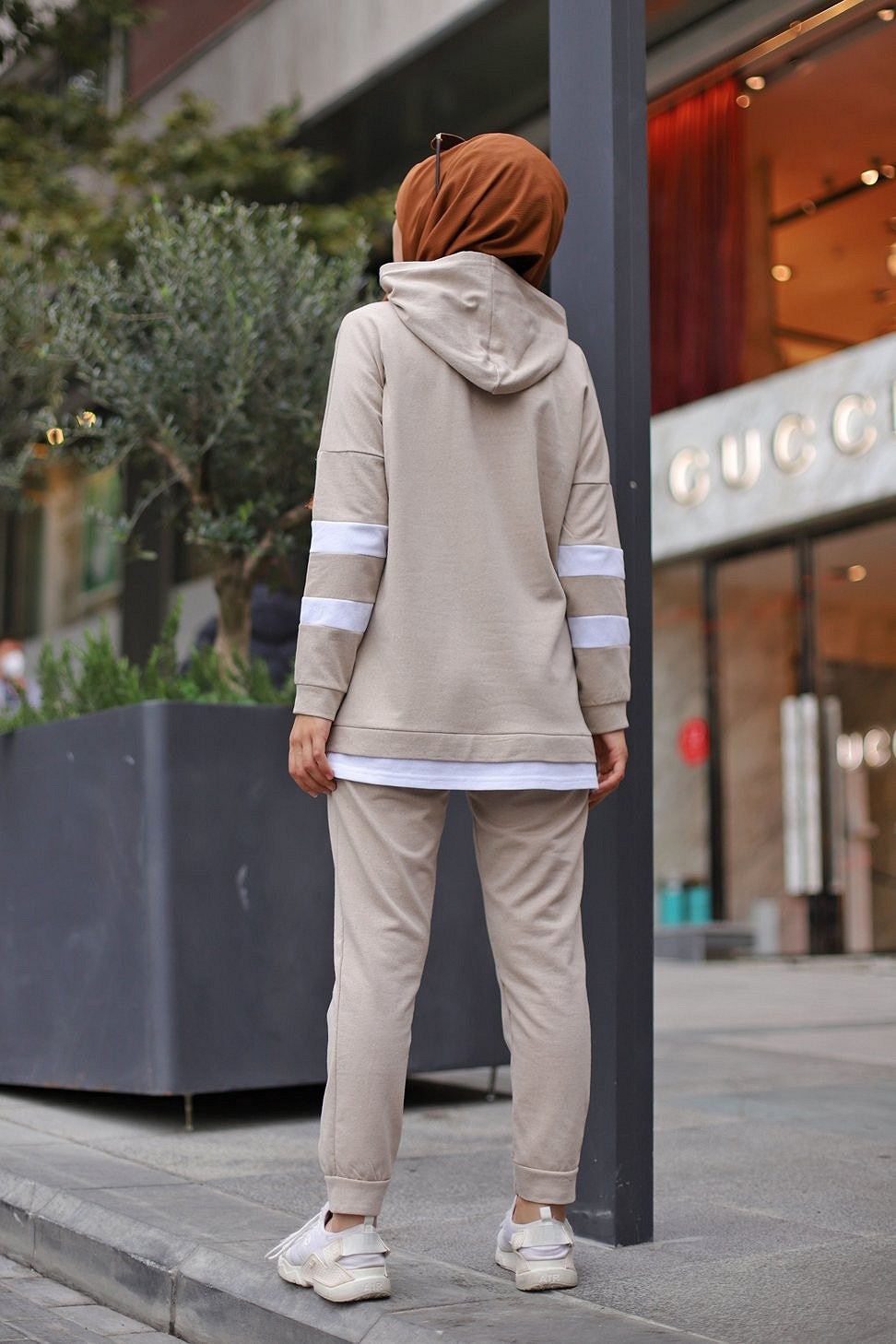 Ensemble survêtement 2 pièces (Haut à capuche et bas et jogger) pour femme voilée - Couleur blanc et Camel - REF. 32948 (28.00 €)