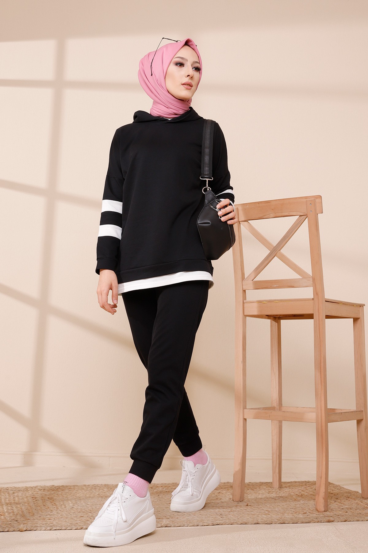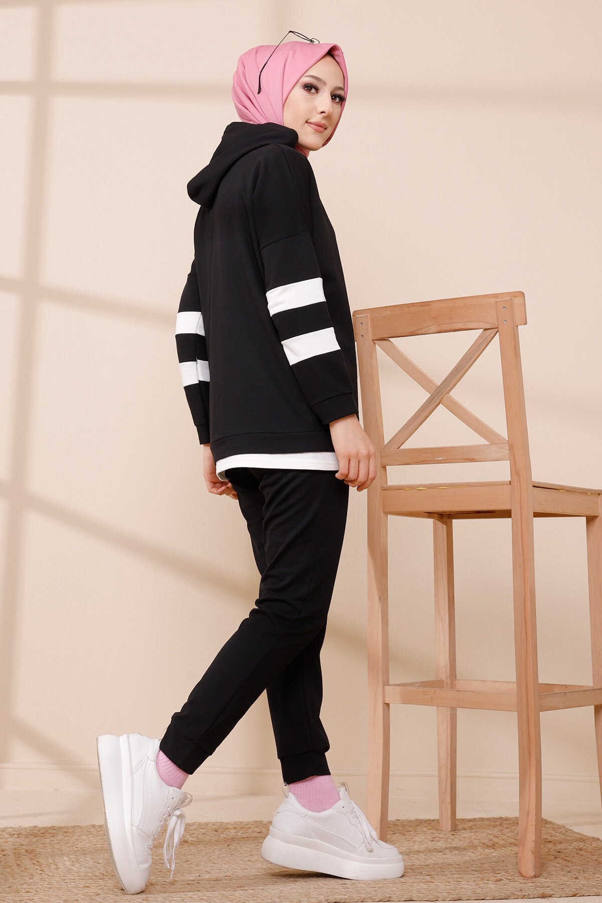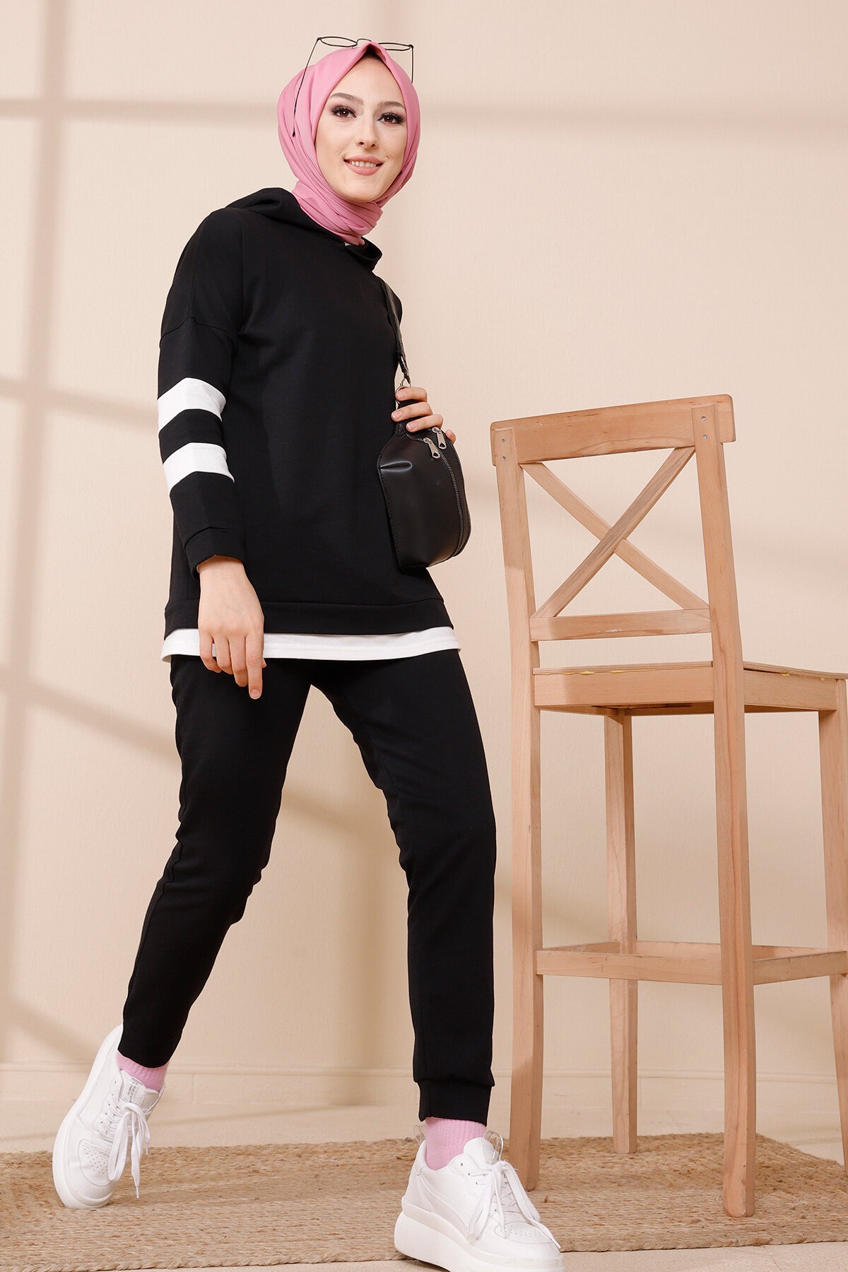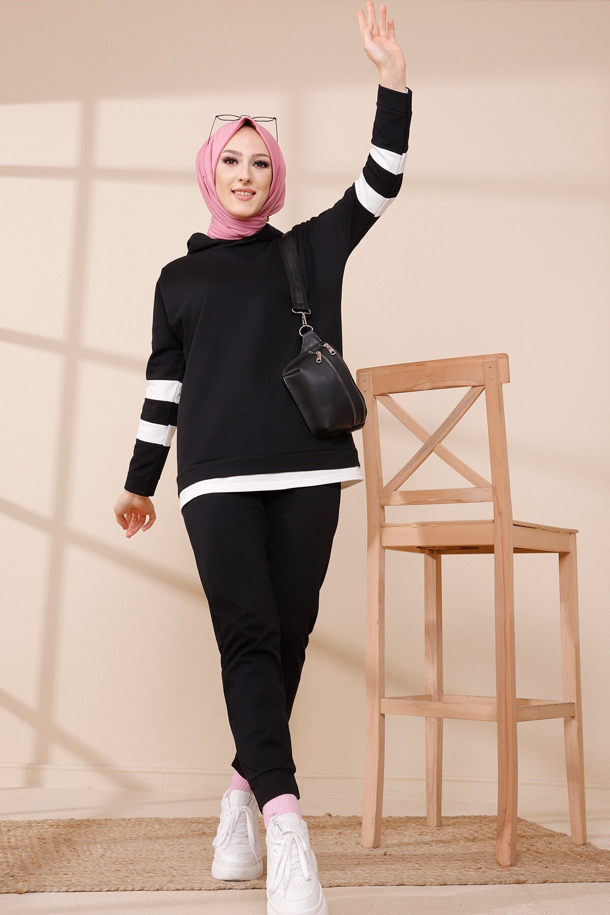 Survêtement femme deux pièces bicolore à capuche (Ensemble sport hijab pas cher) - Couleur noir avec bandes blanches Vetement & Accessoire