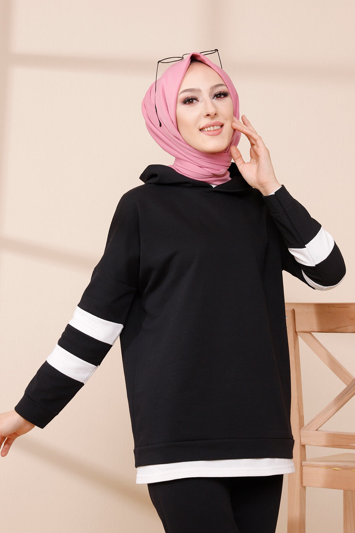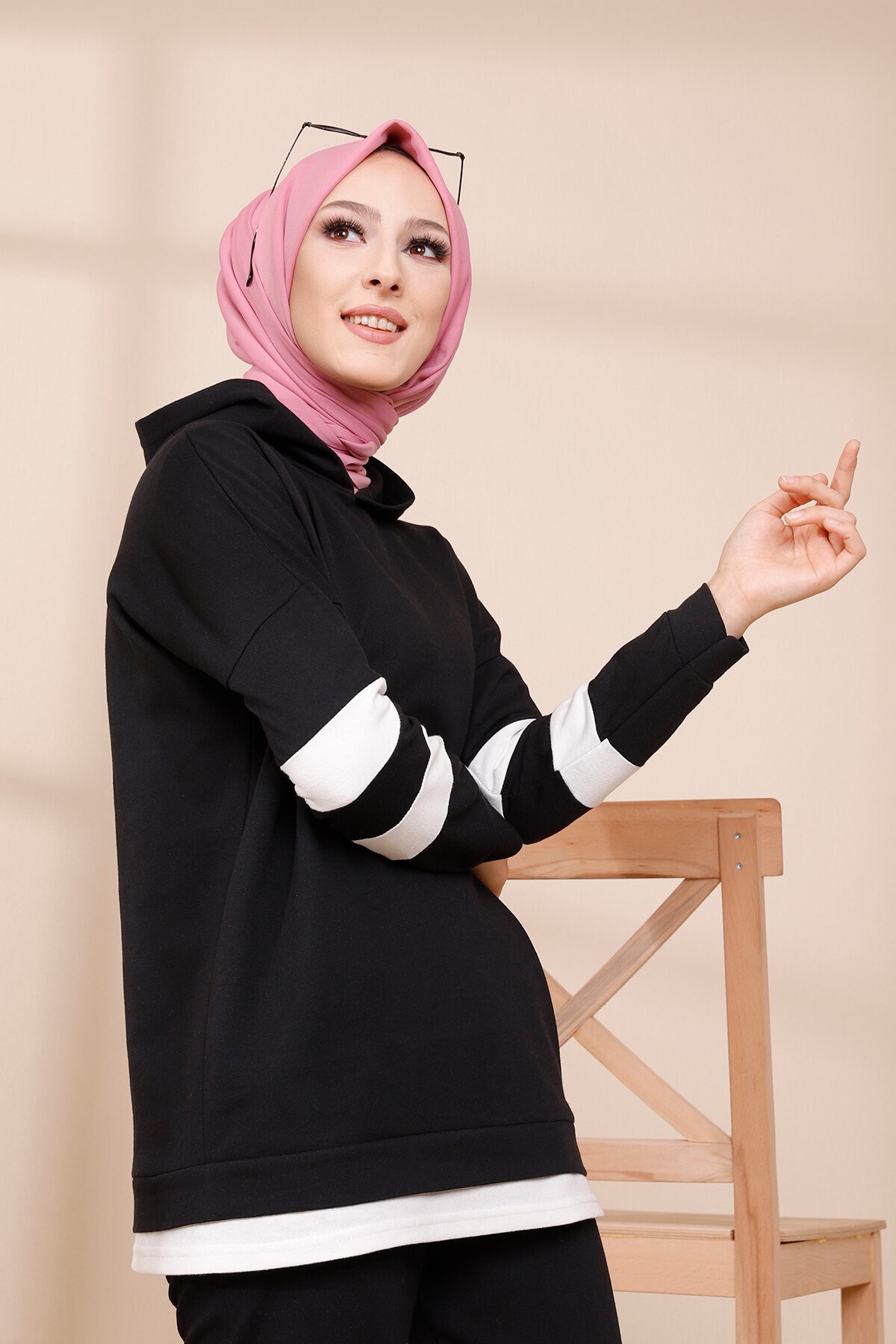 Survetement femme deux pieces bicolore a capuche (Ensemble sport hijab pas cher) - Couleur noir avec bandes blanches