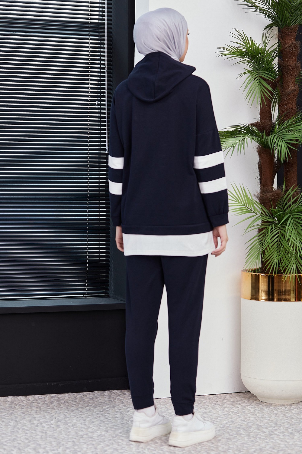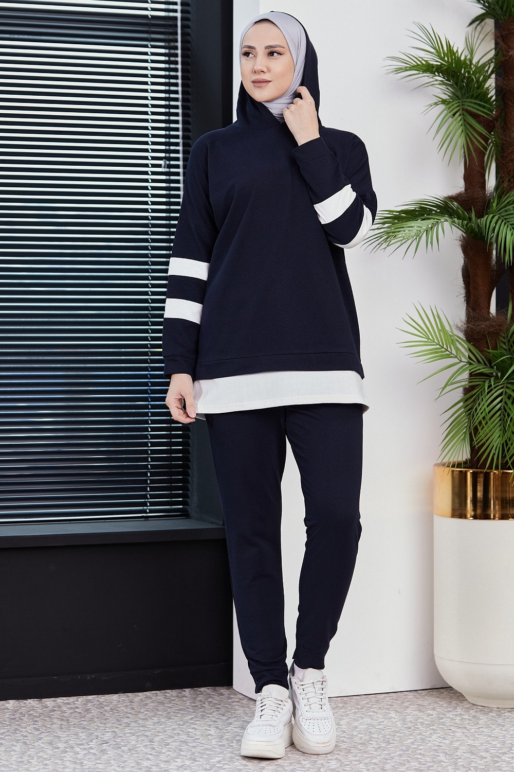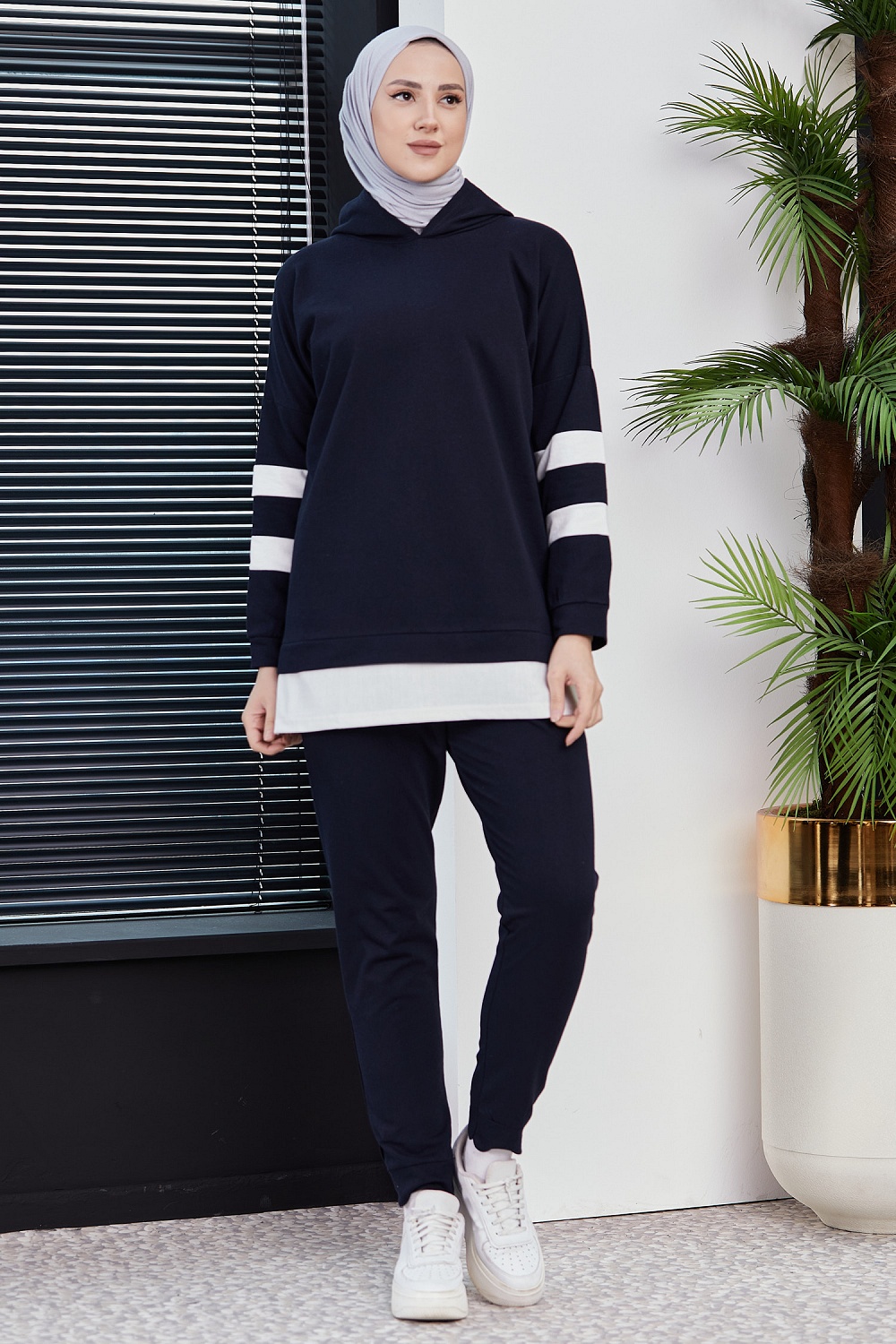 Survêtement femme deux pièces bicolore à capuche (Ensemble sport pas cher - Mode musulmane) - Couleur bleu marine avec bandes blanches Vetement & Accessoire