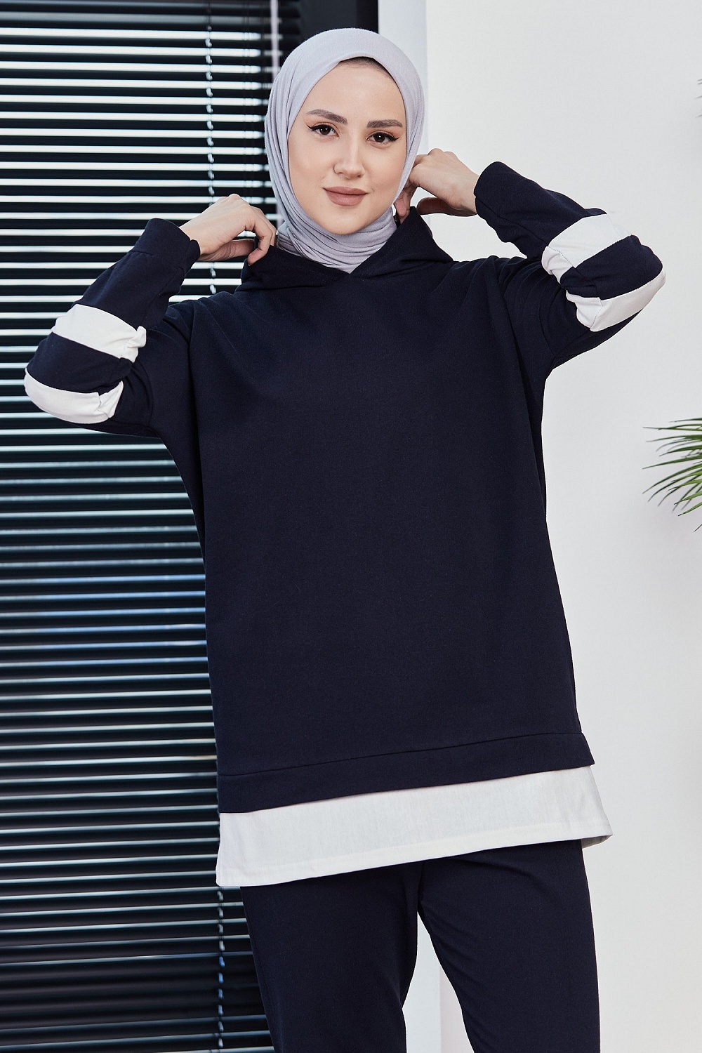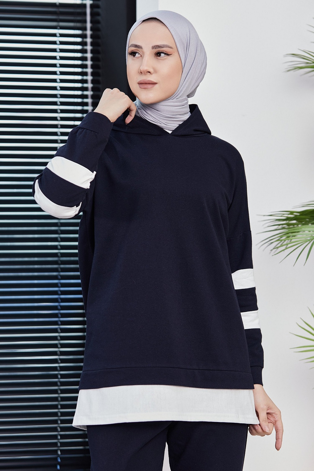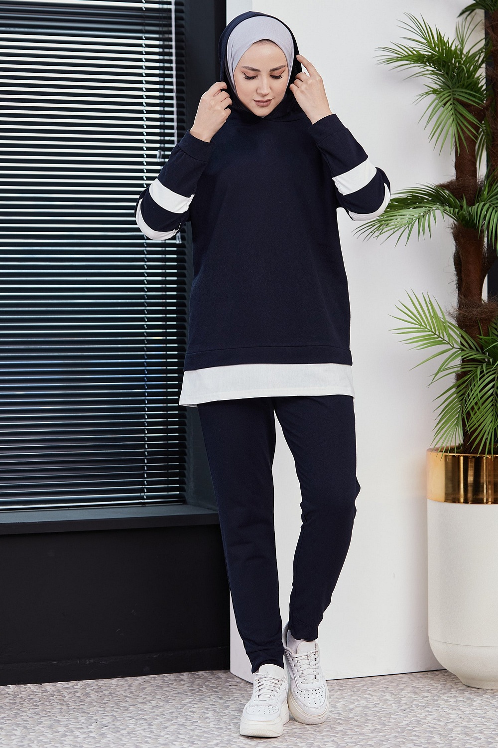 Survêtement femme deux pièces bicolore à capuche (Ensemble sport pas cher - Mode musulmane) - Couleur bleu marine avec bandes blanches Vetement & Accessoire