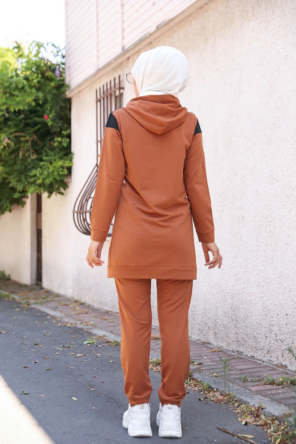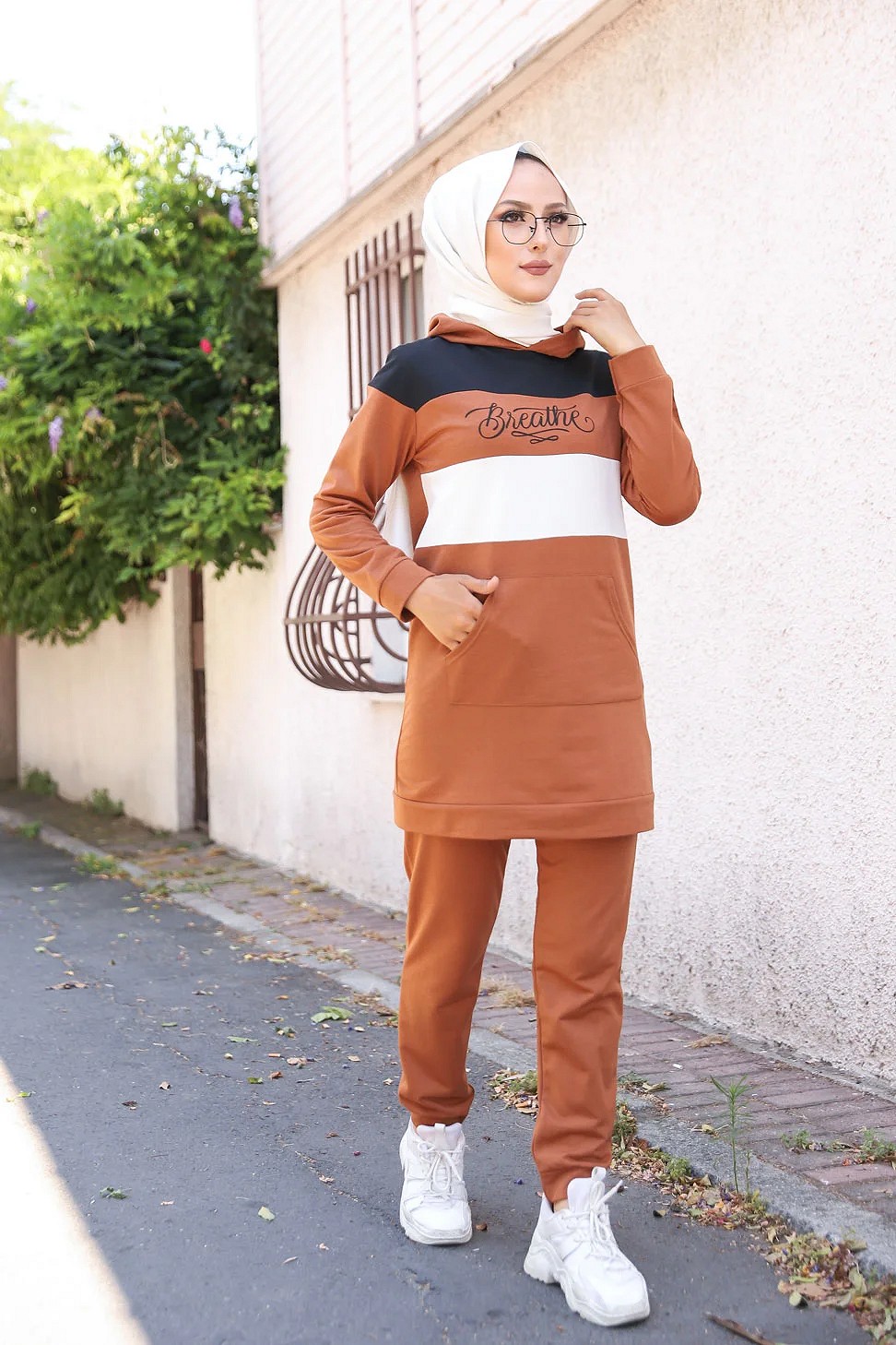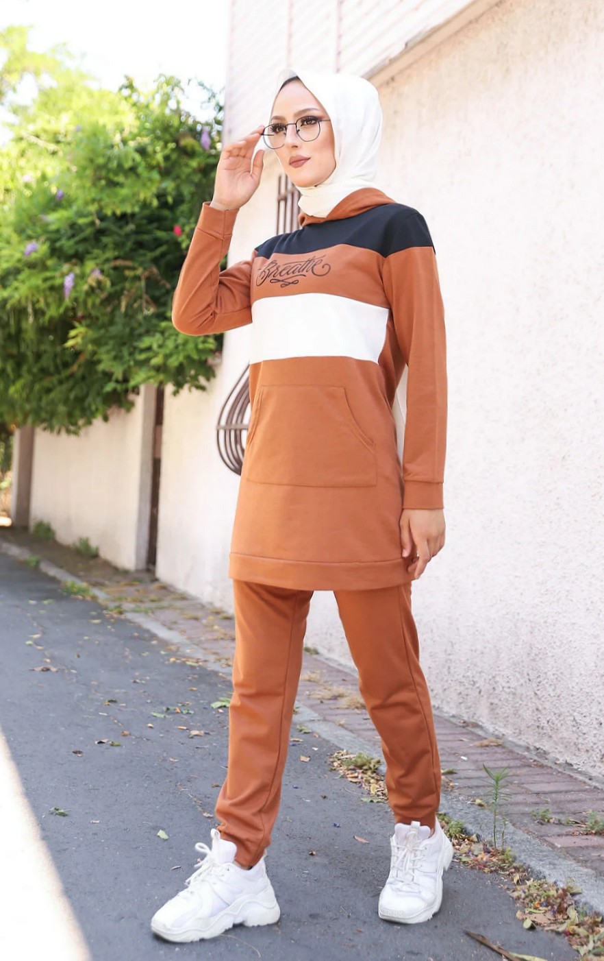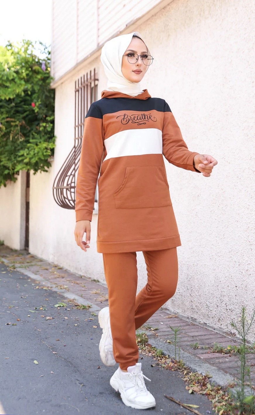 Survêtement tricolore à capuche imprimé "Breathe" (Vetement hijab décontracté et sport) - Couleur Rouille, noir et blanc Vetement & Accessoire