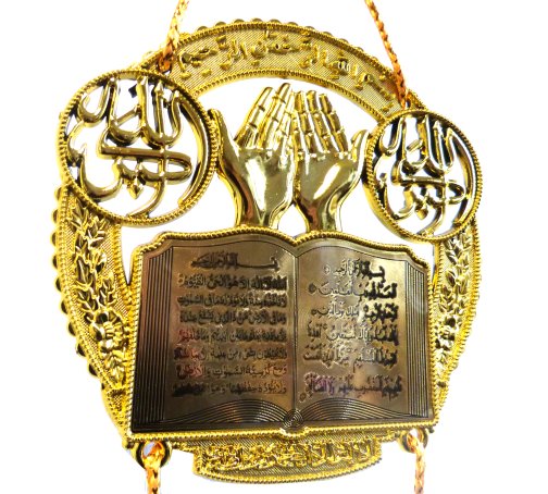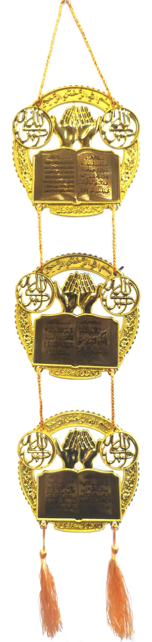 Pendentif doré constitué de trois parties avec les inscriptions calligraphiques de plusieurs sourates du Saint Coran : Al-Fâtiha, Al Falaq, An-Nass, Yâ Sîn ainsi que le verset du Trône et d'autres inscriptions islamiques.