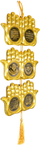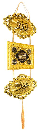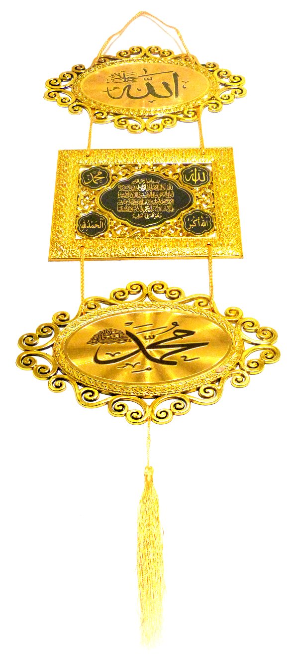 Les éléments du tableau contiennent les inscriptions suivantes : : Allah, le verset du trône et Mohammed.