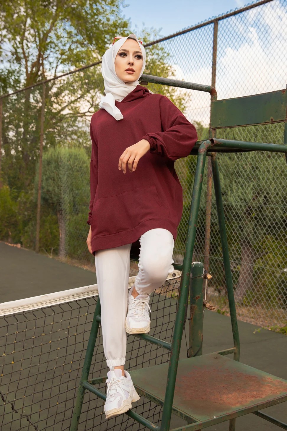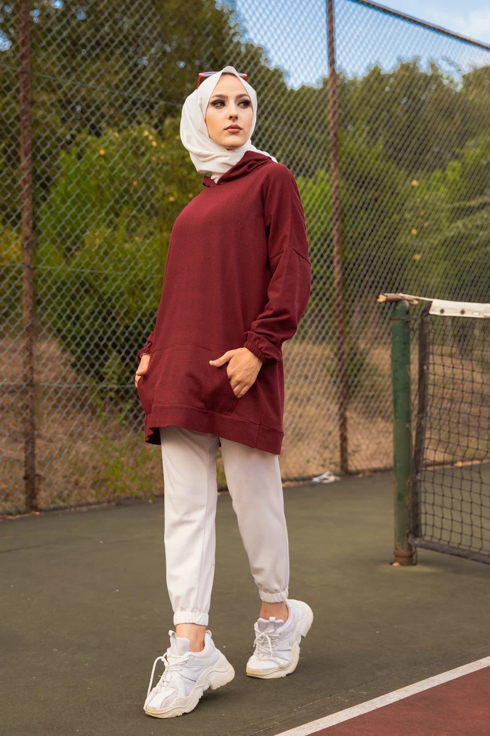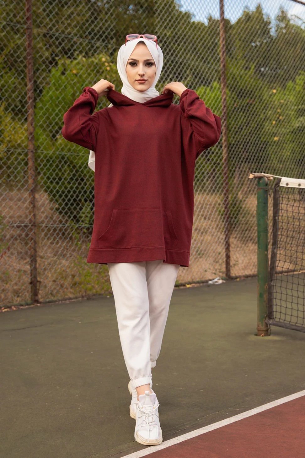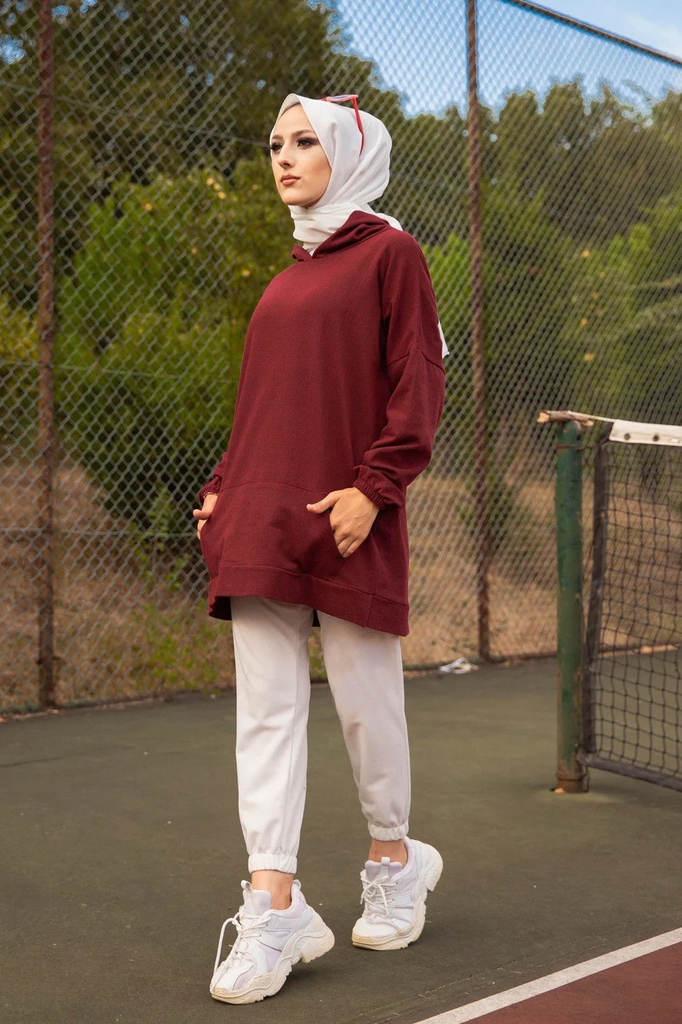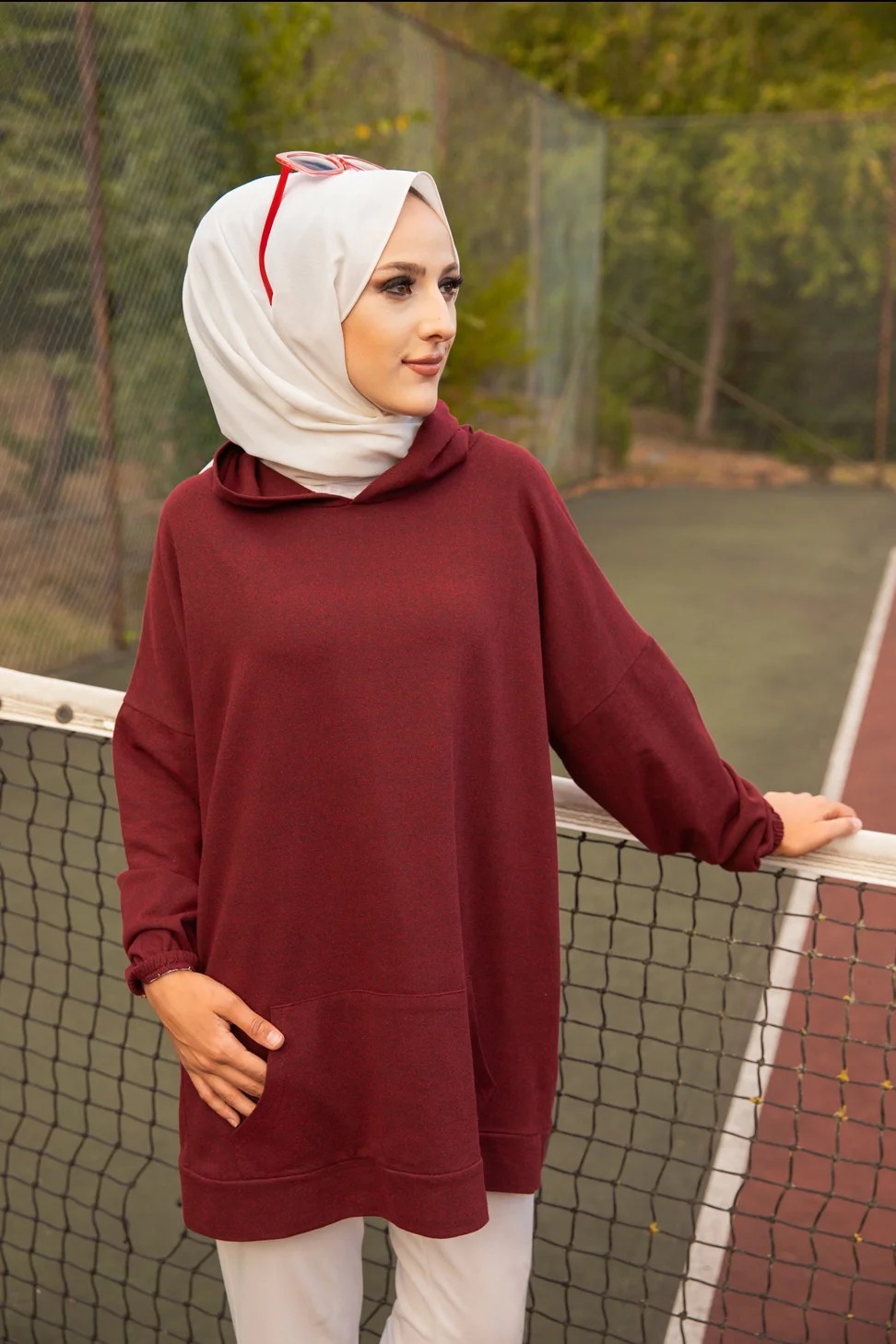 Sweatshirt long avec capuche style moderne décontracté et sport (Vetement voyage femme musulmane) - Couleur Rouge - REF. 32339 (19.90 €) - En Promotion à 16.90 €