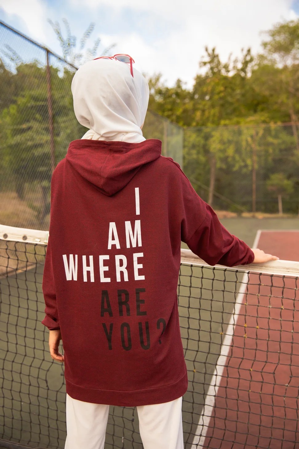 Sweat ample à capuche pour femme imprimé au dos "I am where are you?" (Tenue Sport pour Hijab) - Couleur Bordeaux Vetement & Accessoire