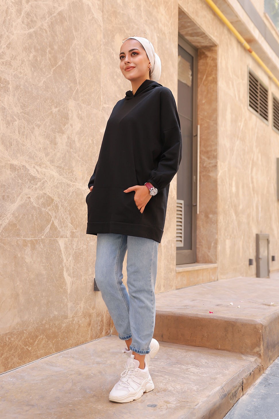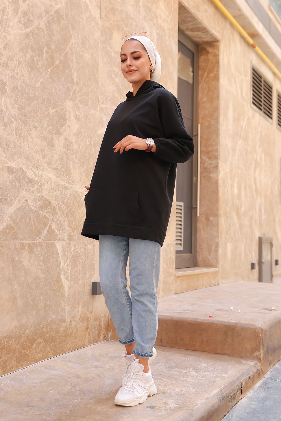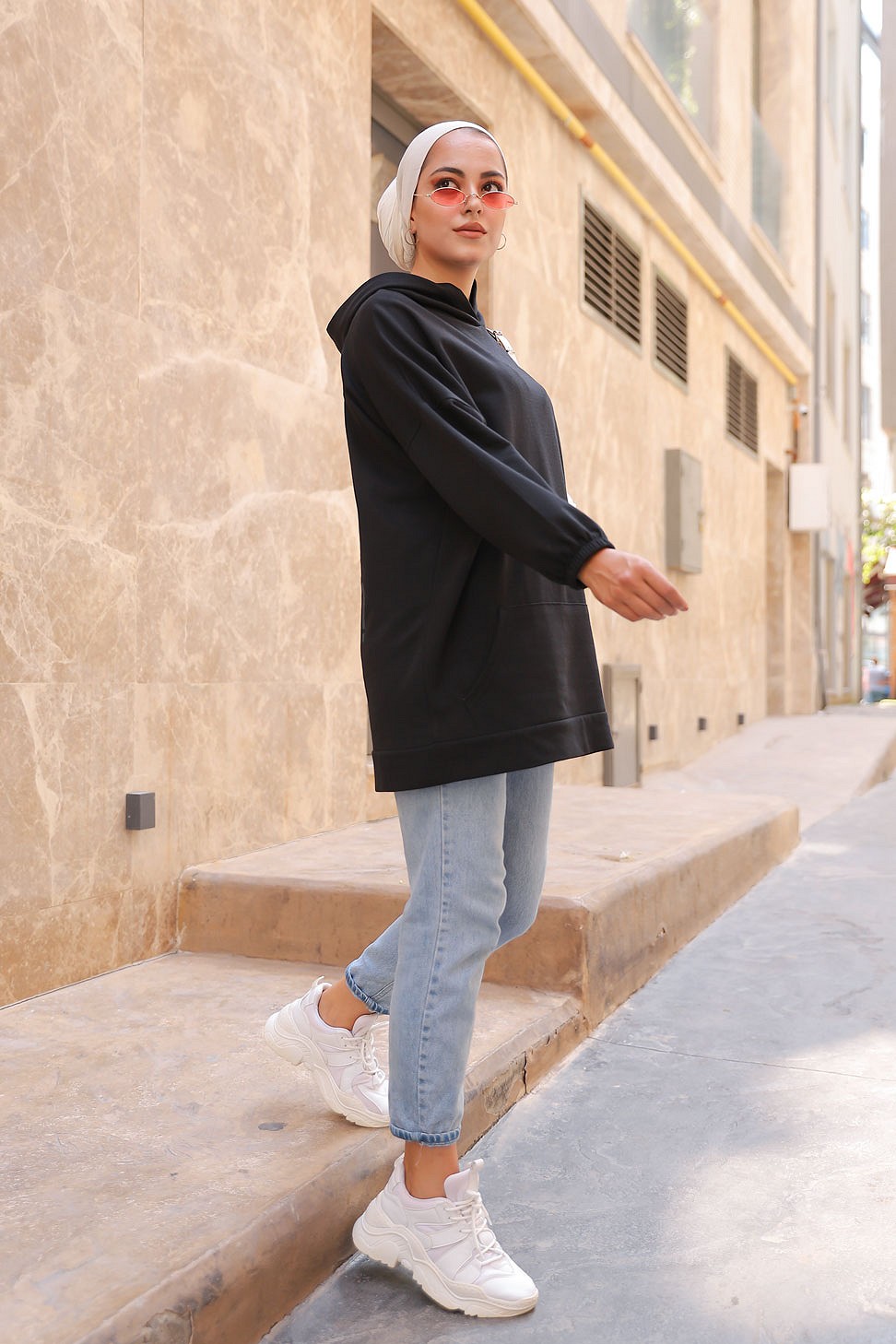 Sweatshirt long avec capuche style moderne décontracté et sport (Vetement voyage femme musulmane) - Couleur Bleu marine - REF. 32851 (19.90 €)