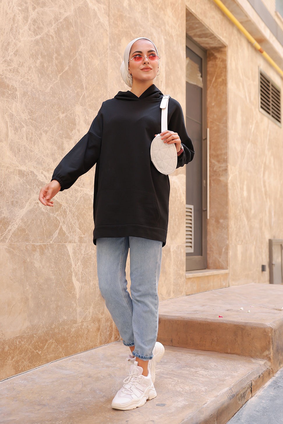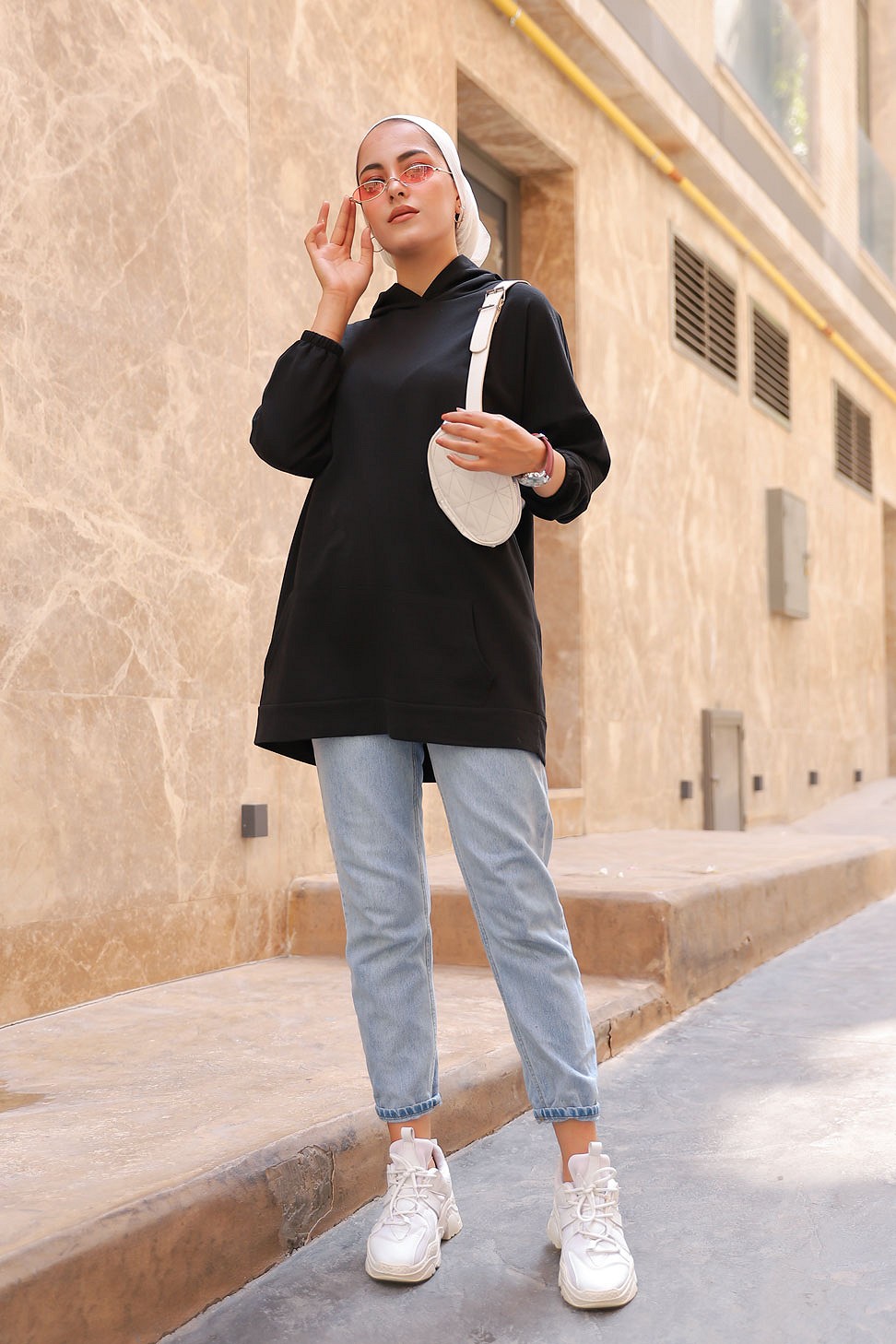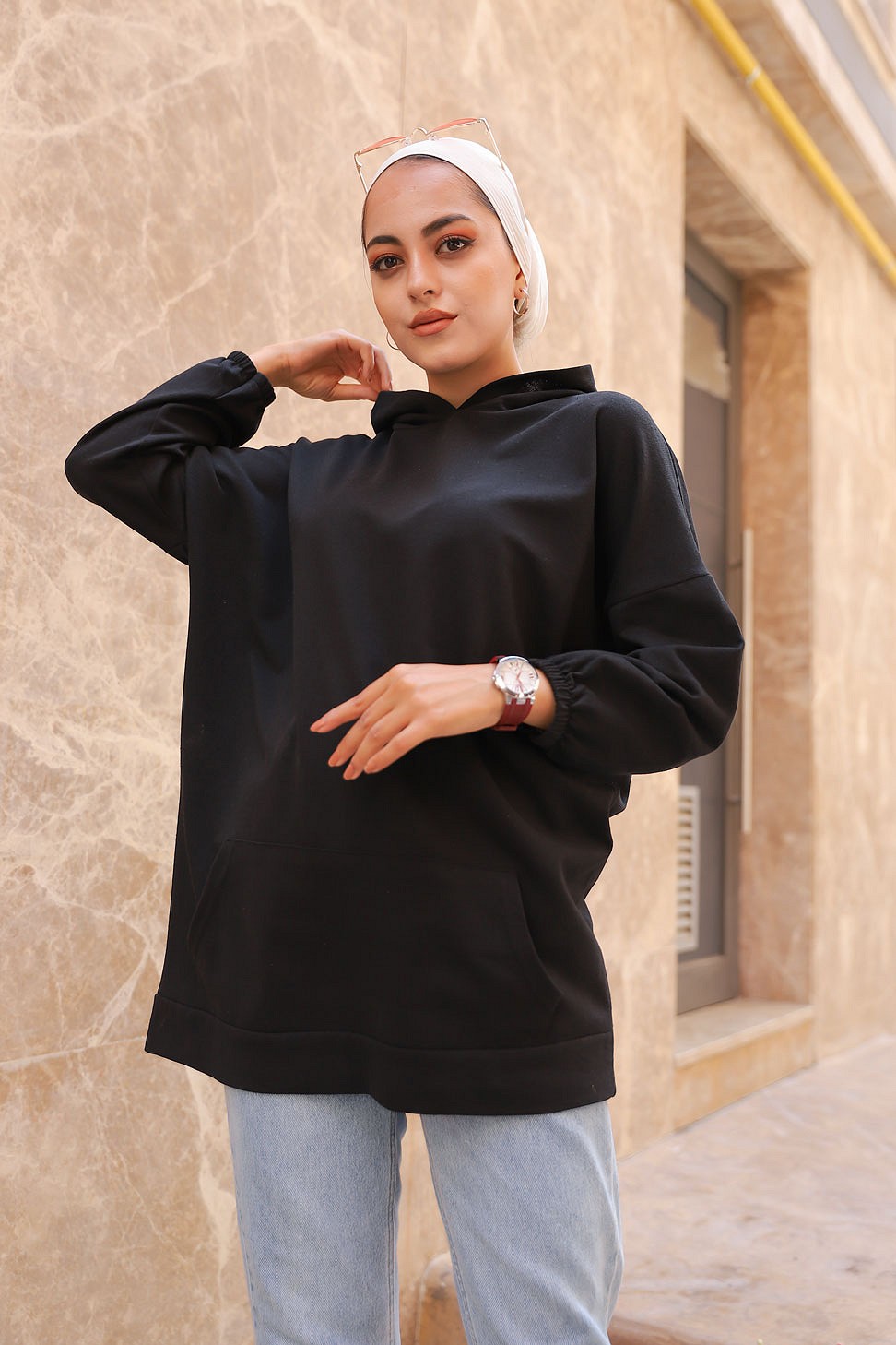 Sweatshirt long avec capuche style moderne décontracté et sport (Vetement voyage femme musulmane) - Couleur Bleu marine - REF. 32851 (19.90 €)