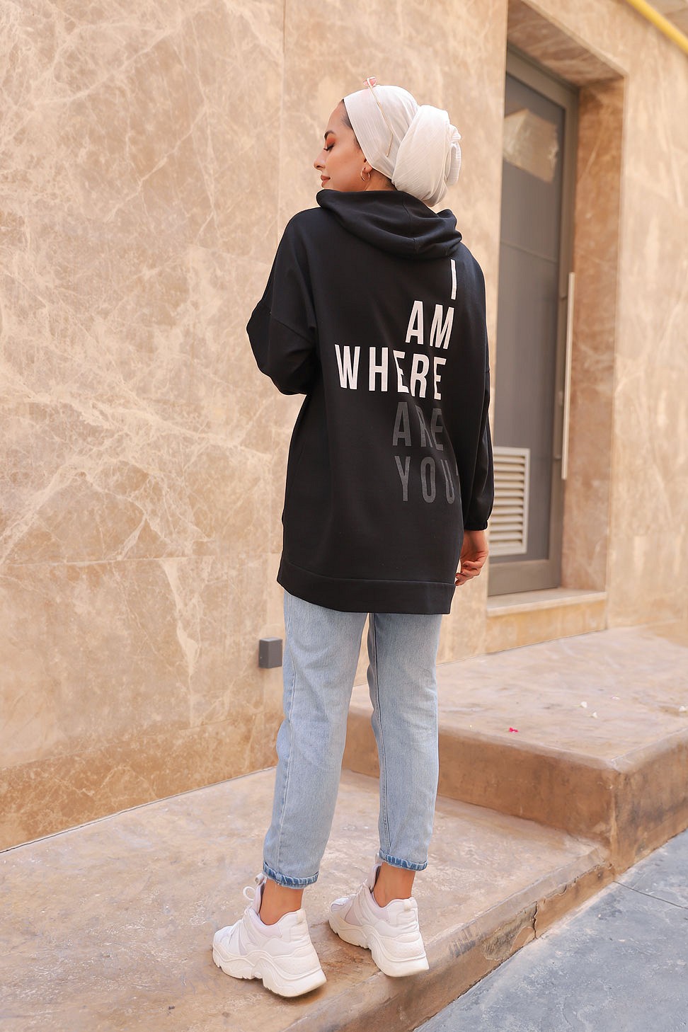 Sweat avec capuche pour femme inscription au dos "I am where are you?" - Couleur noir Vetement & Accessoire