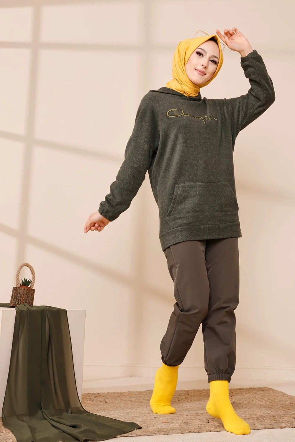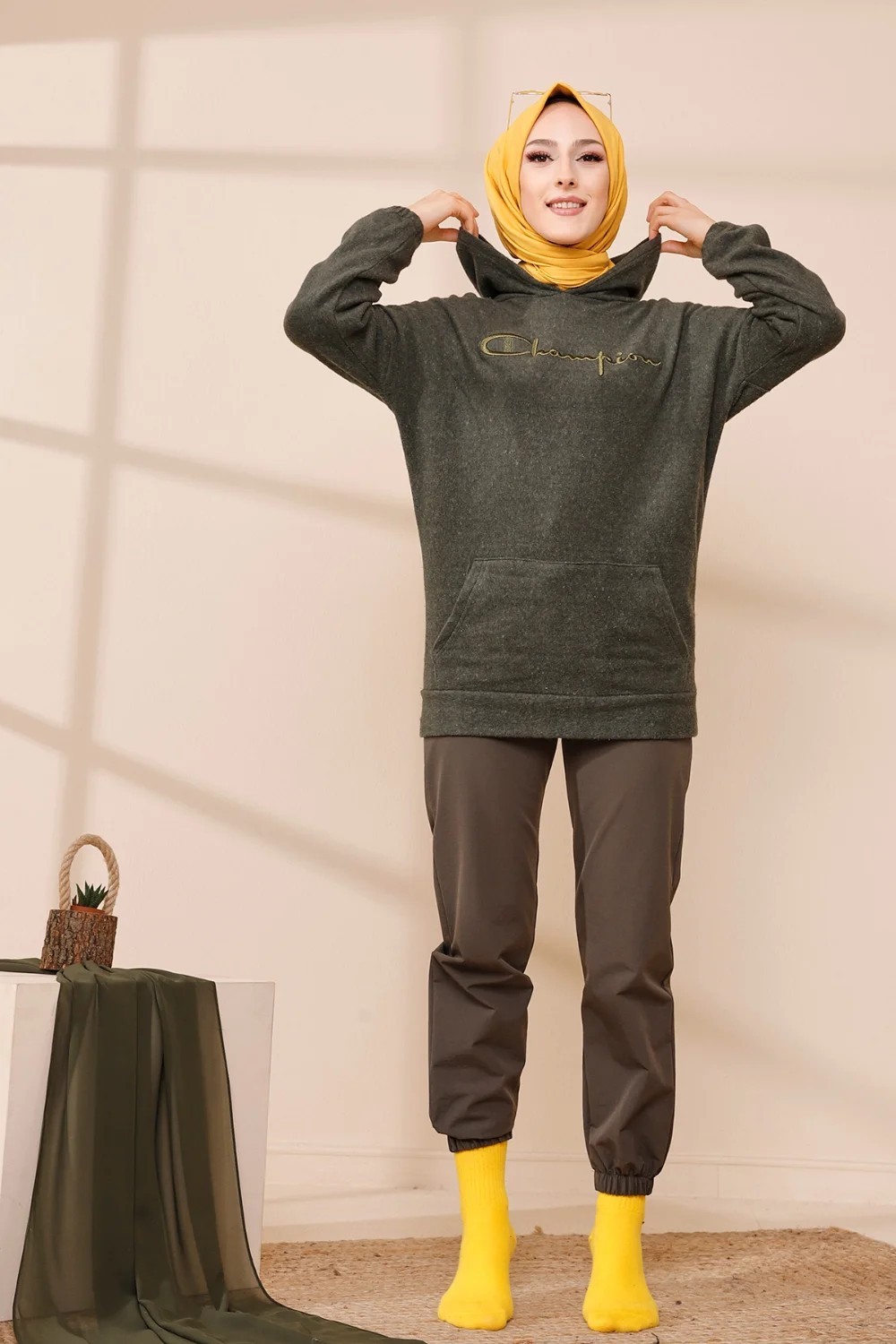 Sweat femme avec capuche brodé "Champion" (Saison Automne-Hiver) - Couleur kaki Vetement & Accessoire