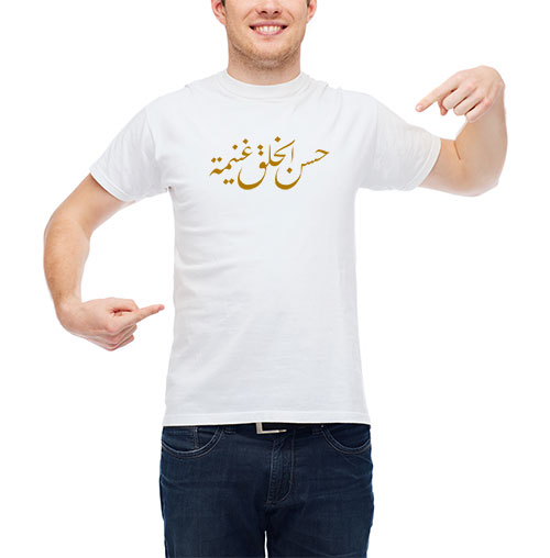 T-Shirt moderne personnalisable avec calligraphie arabe de l'adage "Le bon comportement est une richesse" حسن الخلق غنيمة.