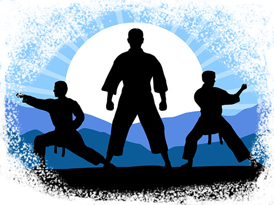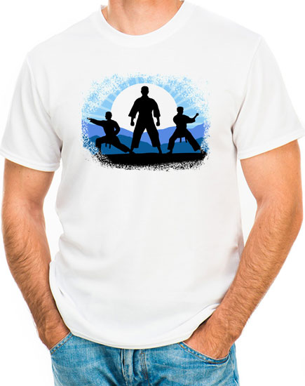 T-Shirt moderne avec illustration représentant l'esprit des arts martiaux avec des karatékas dans trois postures différentes.