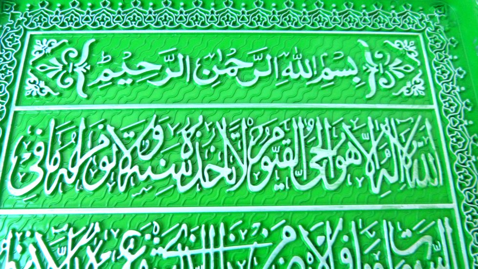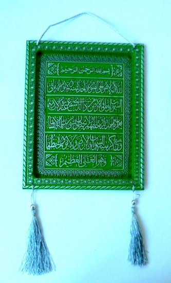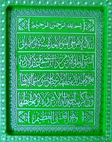 Tableau-Fanion en plastique de couleur verte avec "Ayatoul-Koursî" (Le Verset du Trône) complet.