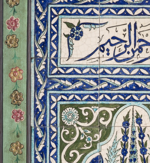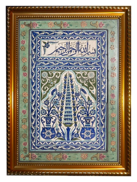 Tableau représentatif de l'art islamique (réplique d'une oeuvre d'art unique provenant de musées ou monuments historiques)... Les arts de l'Islam dans le monde musulman (de l'Espagne jusqu'à l'Inde et habité par des populations de culture islamique diverses). On y lit en haut la formule de la basmala...
