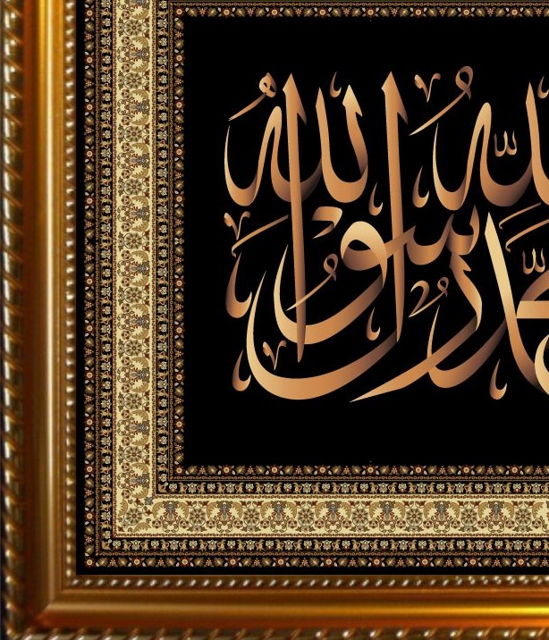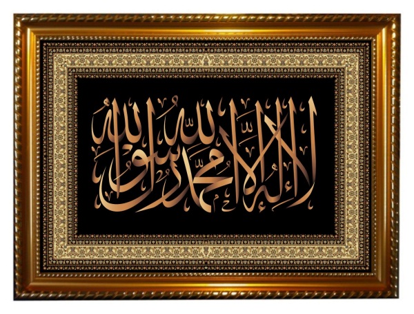 Tableau avec fond noir contenant la calligraphie de La chahada (ٱلشَّهَادَة), « témoignage » ou encore « attestation» de foi). C'est la profession de foi essentielle de l'islam, dont elle constitue le premier des cinq piliers qui définissent les bases de la croyance musulmane : لا اله الا الله محمد رسول الله