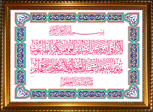 Tableau avec calligraphie en style Thuluth de la Sourate N°2 Al Baqara - Verset 256.