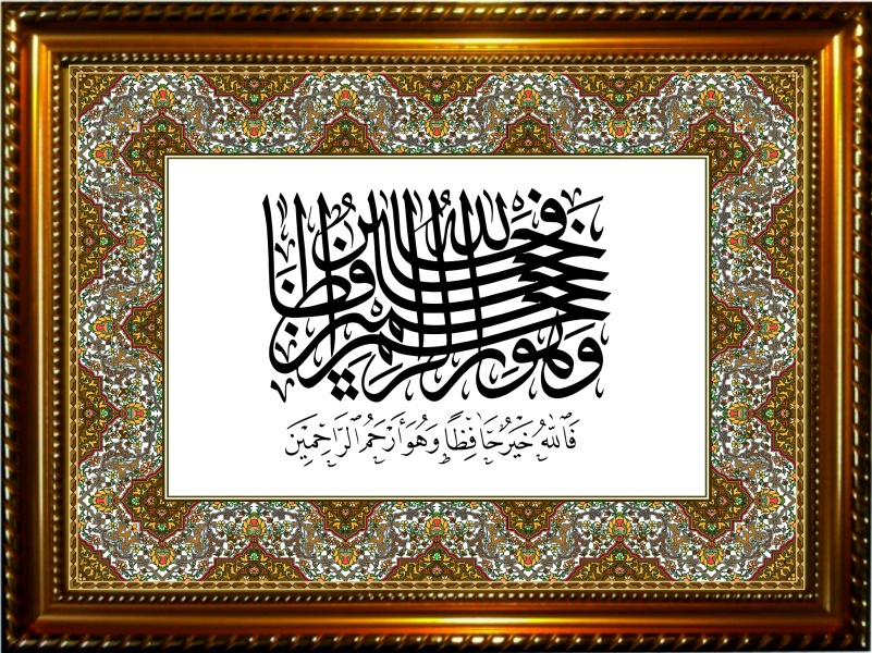 Vous recevrez ce tableau unique avec encadrement bois décoré contenant la calligraphie du verset n°64 de Sourate Youssouf : "...Mais Allah est le meilleur gardien, et Il est Le plus Miséricordieux des miséricordieux !»