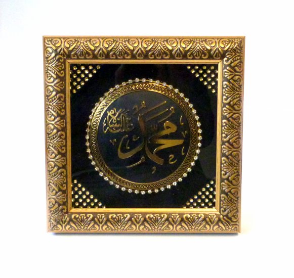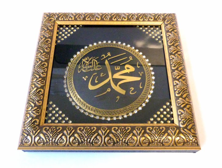 Très beau tableau (20 x 20 cm) en bois doré et décoré de strass. Au centre se trouve la calligraphie du nom du Prophète "Muhammad" (saw).