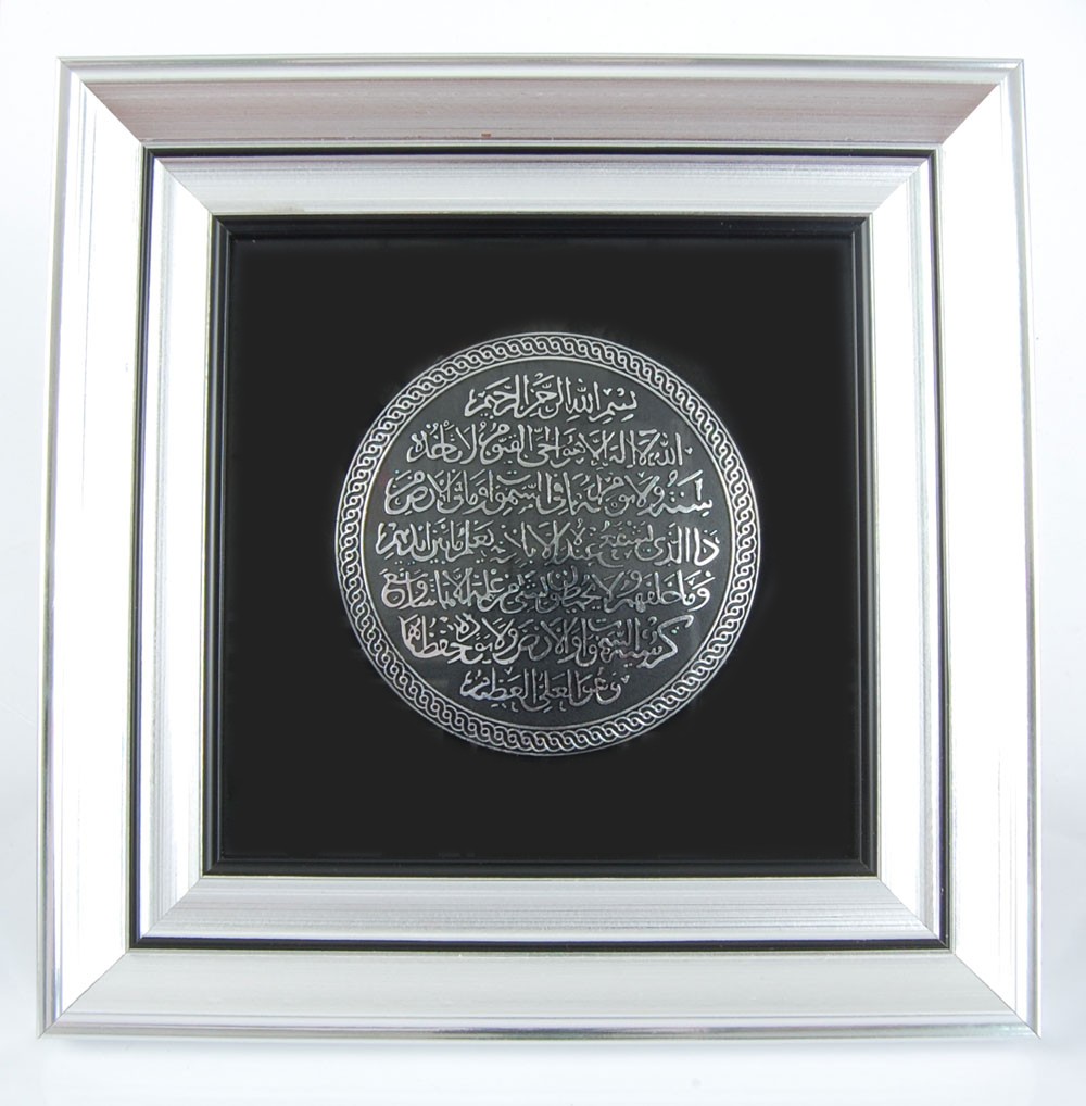 Tableau en bois argenté avec le verset du Trône (Ayatoul Koursi).posé sur un meuble.
