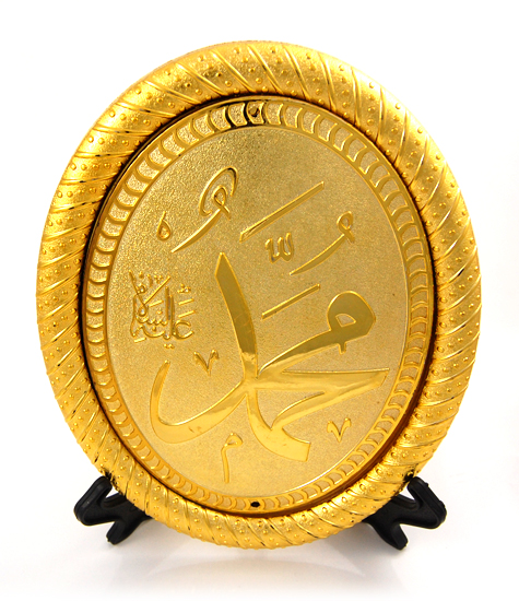 Tableau en forme ovale doré avec le nom du prophète Mohammad (صلى الله عليه وسلم) en calligraphie sur trépied.