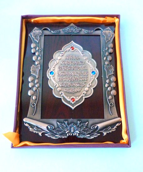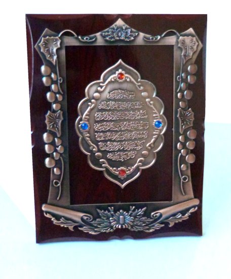 Tableau islamiques en bois avec "ayatoul-Koursi" avec jolie reliefs métallique couleur bronze et diamants rouges et bleus.