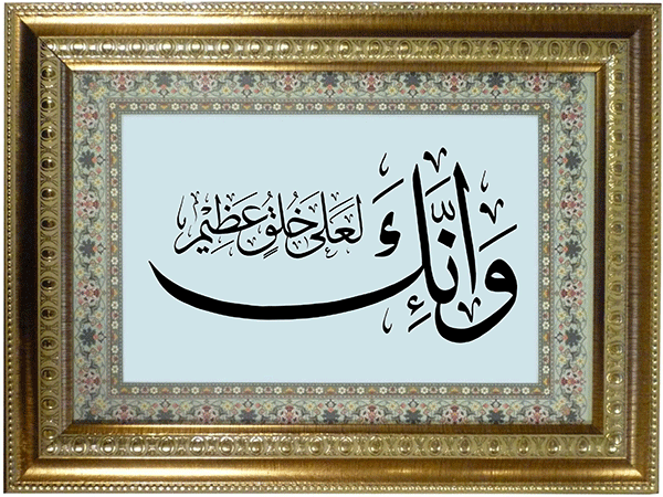 (wa’innaka la'ala khoulouqin 'adhim) ce qui signifie : « Tu as certes un comportement d’excellence. » [Al-Qalam / 4] (il s'agit du verset coranique calligraphié sur le tableau)
