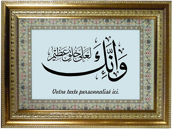 Vous recevrez un tableau avec encadrement bois décoré et doré contenant la calligraphie de sourate Al-Qalam 68, verset 4 ainsi qu'un texte optionnel de votre choix (personnalisable) en français ou en arabe.