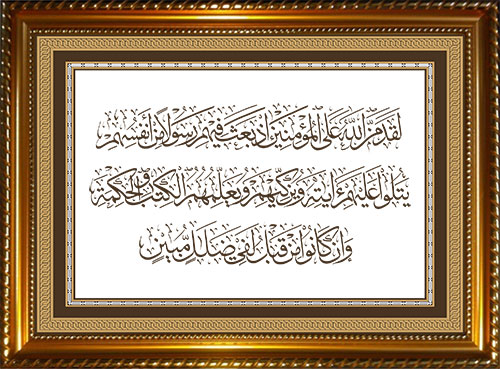 "Allah a très certainement fait une faveur aux croyants lorsqu'Il a envoyé chez eux un messager de parmi eux-mêmes, qui leur récite. Ses versets, les purifie et leur enseigne le Livre et la Sagesse, bien qu'ils fussent auparavant dans un égarement évident."