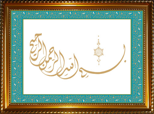 Vous recevrez un tableau avec encadrement bois décoré et doré contenant la calligraphie de la Basmala ainsi qu'un texte optionnel de votre choix (personnalisable) en français ou en arabe. Ce texte sera placé en dessous de la calligraphie.