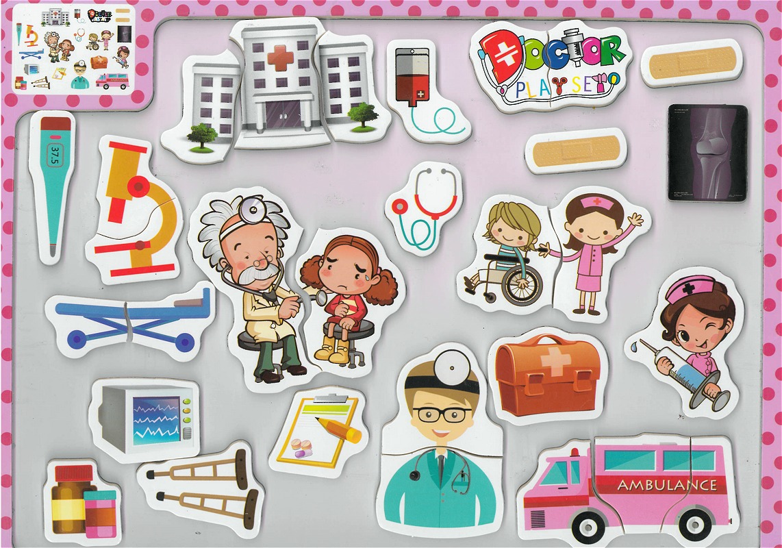 Tableau et puzzle en bois sur la thématique de la médecine (hopital, médecin, infirmière et divers objets en relation avec la médecine et les soins) à assembler et à reconstituer... Permet de développer les capacités de l'enfants dès son plus jeune âge.