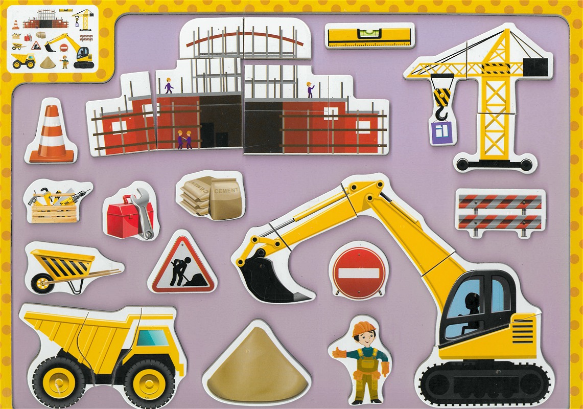Tableau et puzzle en bois contenant divers objets, instruments et engins de construction à assembler ensemble et à reconstituer... Permet de développer les capacités de l'enfants dès son plus jeune âge.