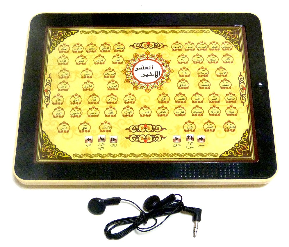 Cette tablette contient des haut-parleurs mais est également fournie avec des écouteurs afin de faciliter l'écoute du Coran en privé.