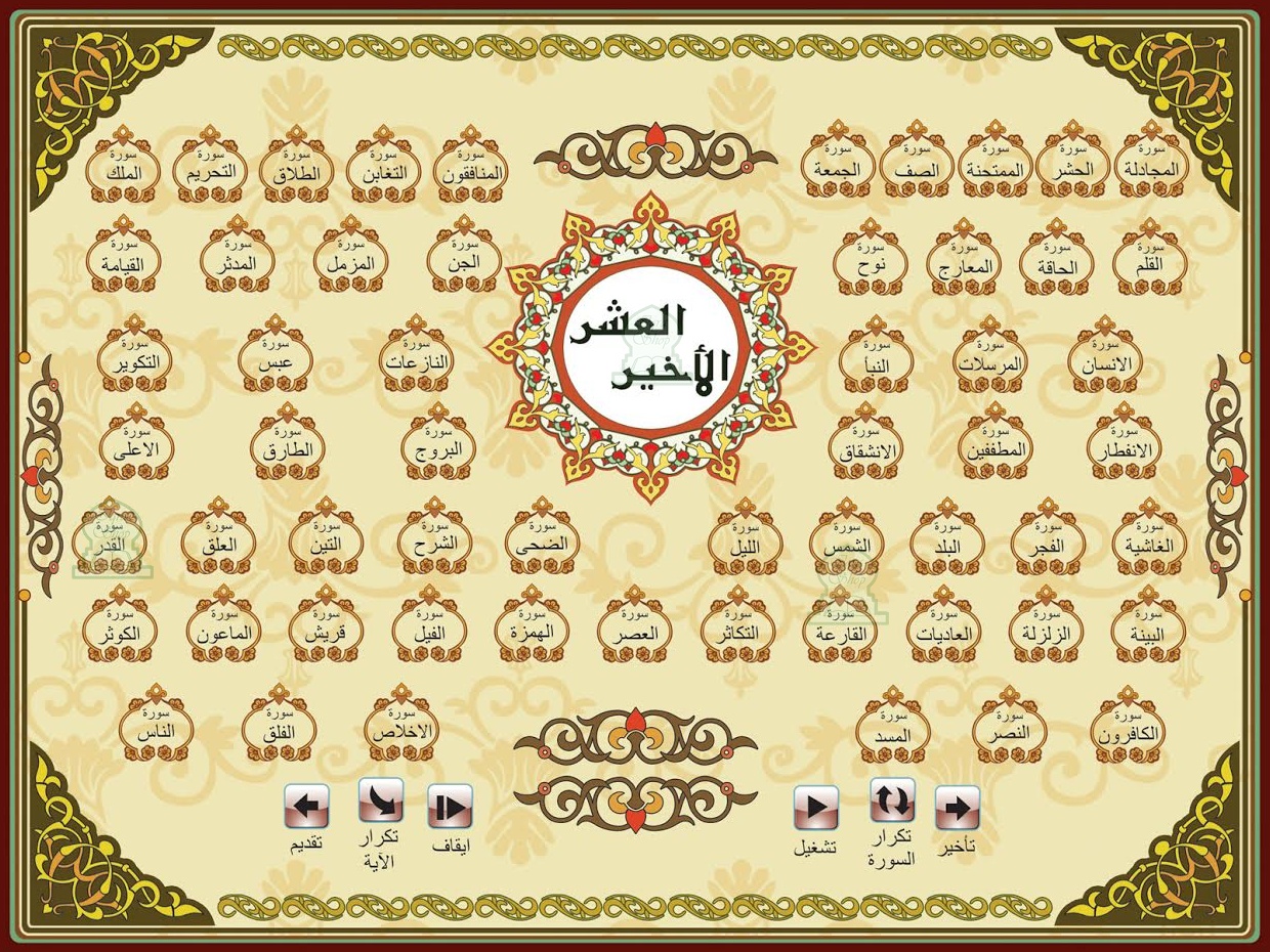 Permet d'écouter, de réviser et d'apprendre par coeur le dernier dixième du Coran (العشر الأخير) : de la Sourate "Al-Mujâdalah" jusqu'à la fin du Coran (Sourate "An-Nass").