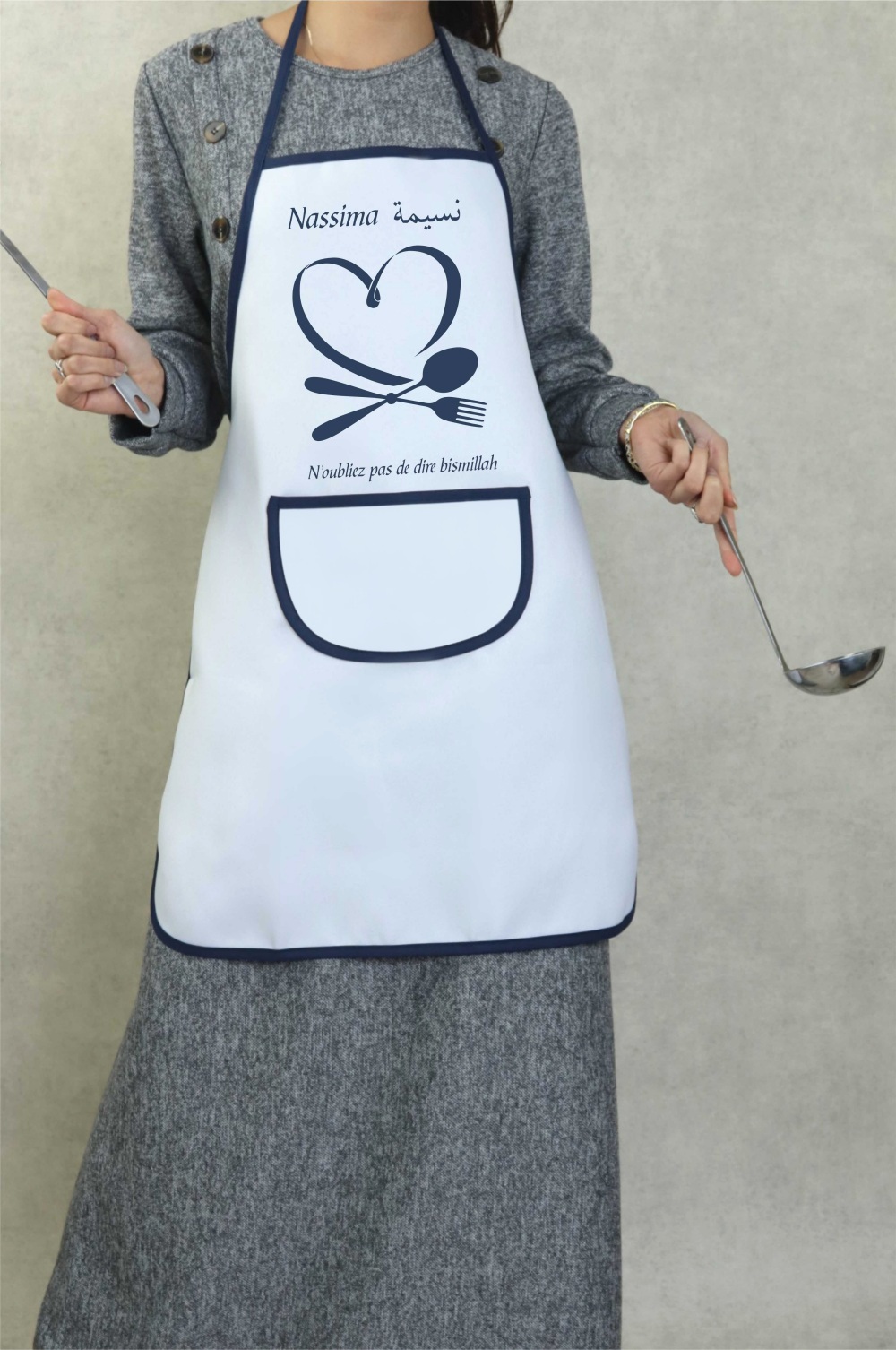 Recevez ce joli tablier de cuisine blanc avec sa grande poche et des bordures de couleur bleu marine. Illustration et/ou inscription de votre choix (prénom, message, etc.)