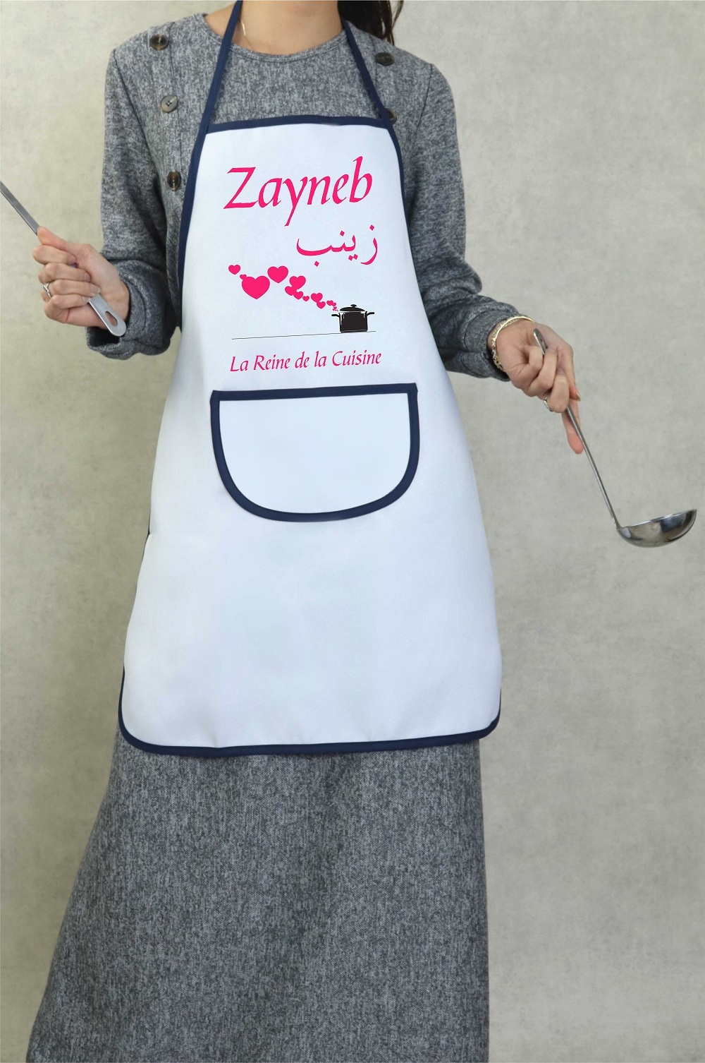 Tablier de cuisine grande poche personnalisable a votre choix (prenom / illustration) - Couleur blanc avec bordures bleu marine