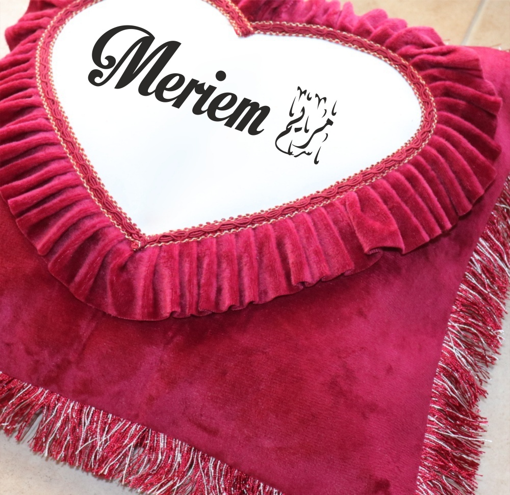 Taie d'oreiller en velours couleur bordeaux avec coeur incruste - Housse de coussin de luxe decoree personnalisable (prenom, message...)