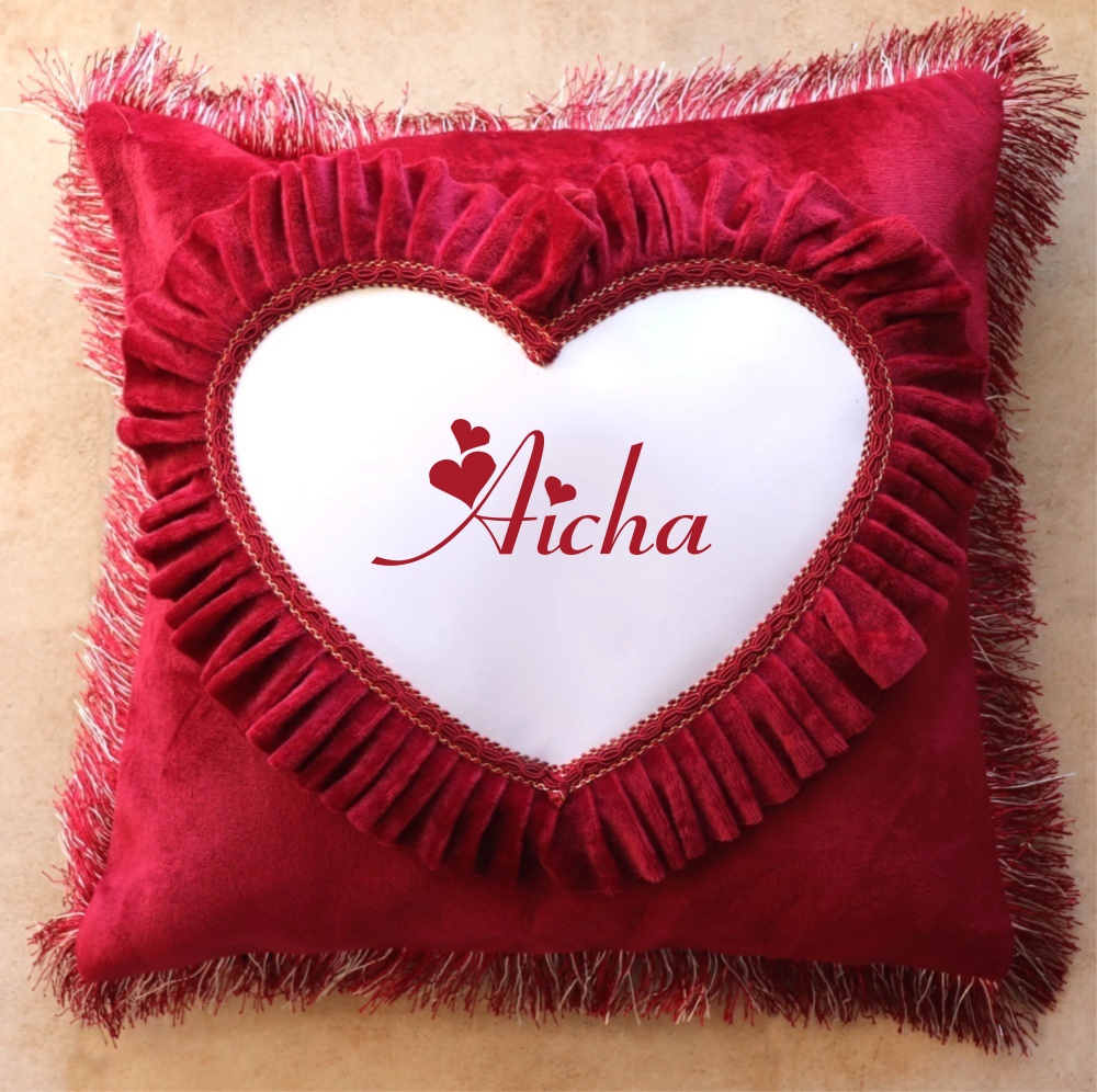 Taie d'oreiller en velours couleur bordeaux avec coeur incrusté - Housse de coussin de luxe décorée personnalisable (prénom, message...) - REF. 31593 (19.00 €)