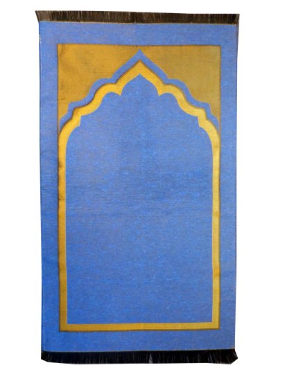 Grand tapis de prière 1 place de couleur unie bleu et avec des parties doré pour indiquer le sens de la Qibla et pour positionner les pieds et la tête du bon côté.