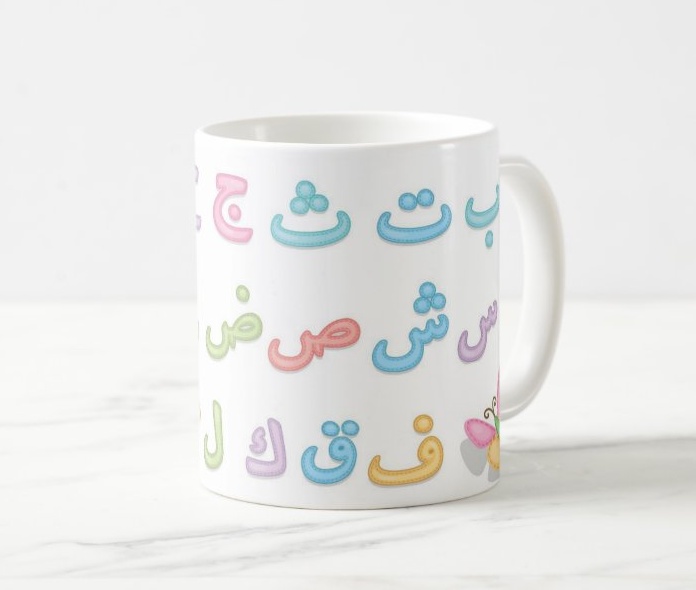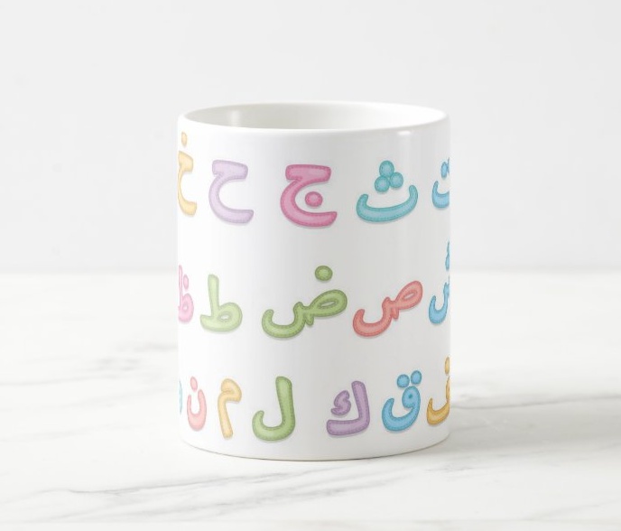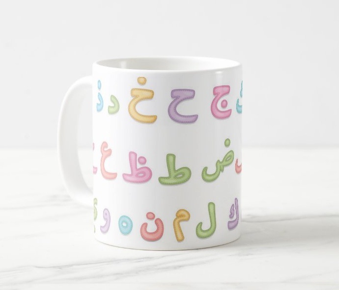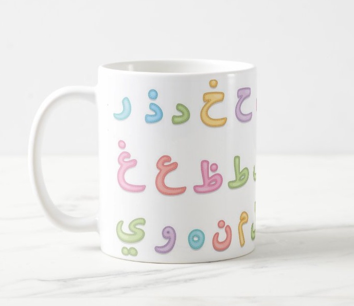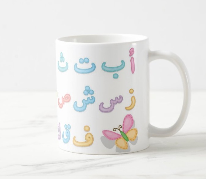 Mug avec l'alphabet arabe pour réviser son alphabet en buvant son lait.