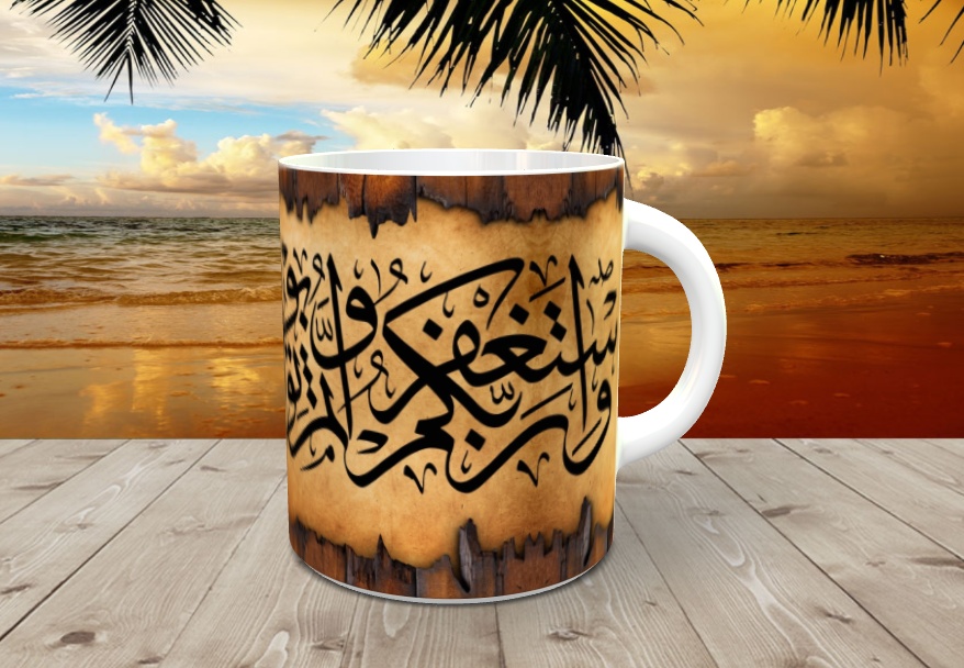 Mug pour boire ou pour décoration avec jolie calligraphie en style Thuluth de sourate Houd Verset 90 : { Et implorez le pardon de votre Seigneur et repentez-vous à Lui. Mon Seigneur est vraiment Miséricordieux et plein d'amour». }