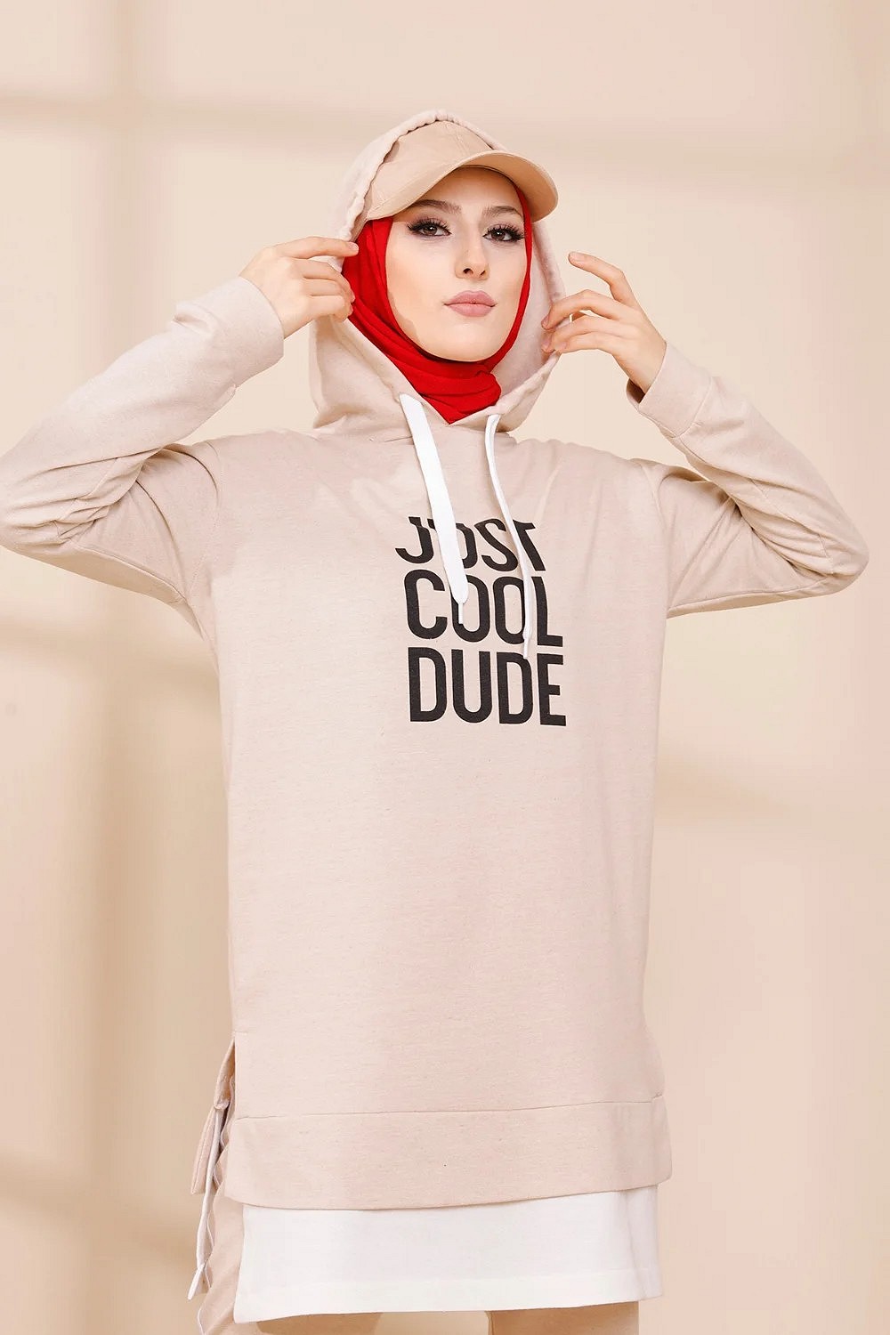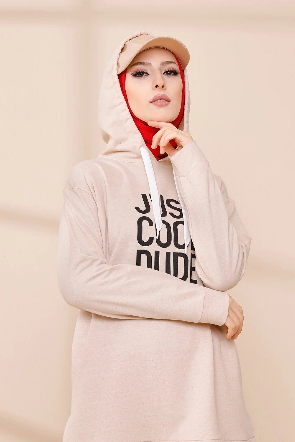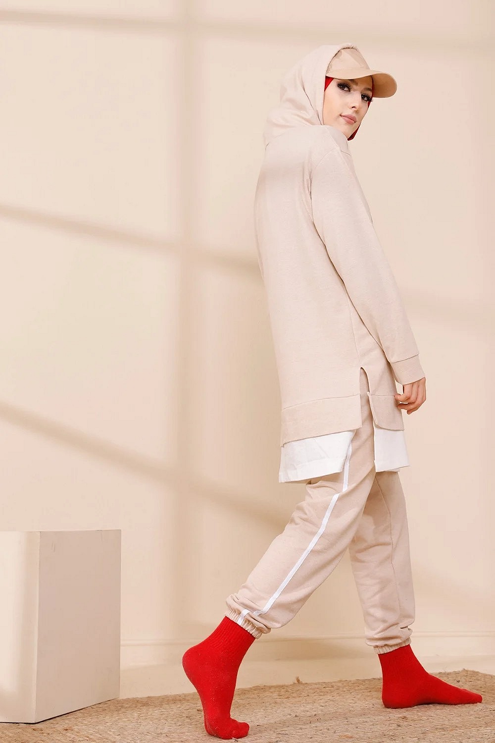 Tenue decontractee avec extension blanche - Sweat a capuche imprime et pantalon (Boutique de vetement moderne pour femme voilee) - Couleur beige clair