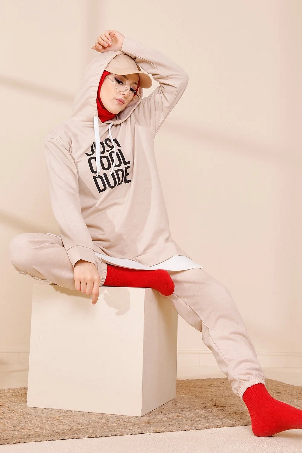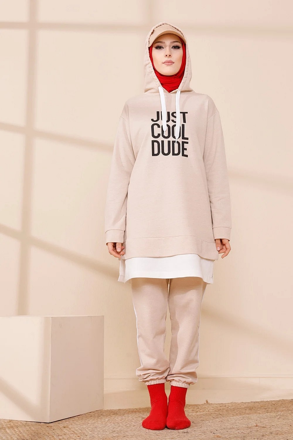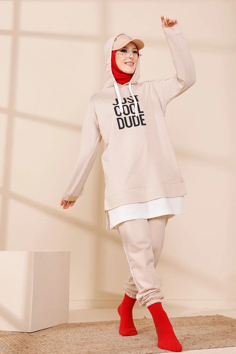 Tenue décontractée avec extension blanche - Sweat à capuche imprimé et pantalon (Boutique de vêtement moderne pour femme voilée) - Couleur beige clair Vetement & Accessoire