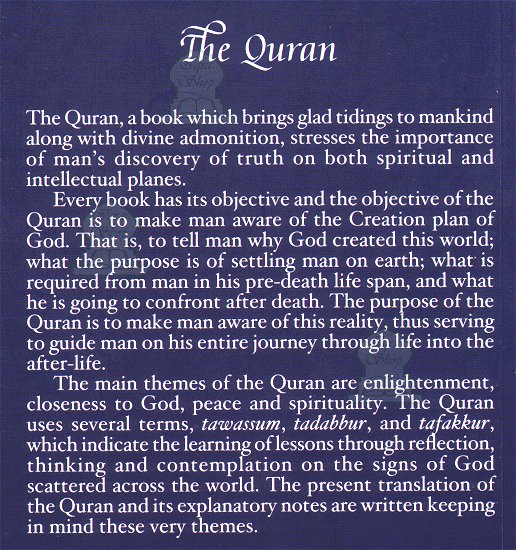 The main themes of the Quran are enlightenment, closeness to God, peace and spirituality. The Quran uses several terms, tawassum, tadabbur, and tafakkur, which indicate the learning of lessons through reflection, thinking and contemplation on the signs of God scattered across the world. The present translation of the Quran and its explanatory notes are written keeping in mind these very themes.