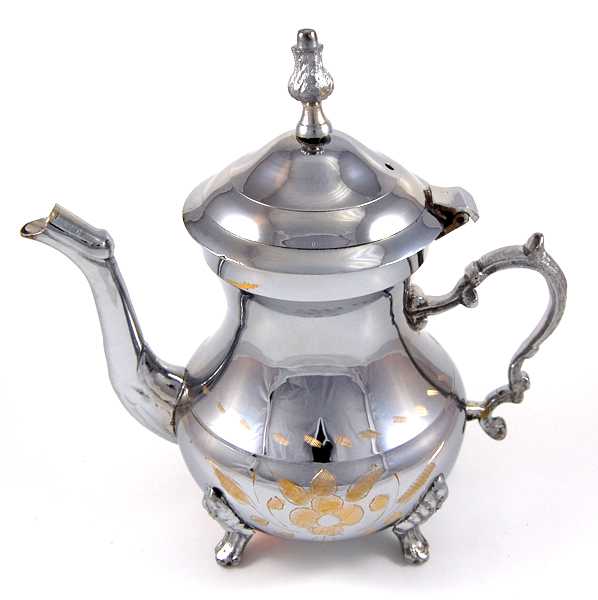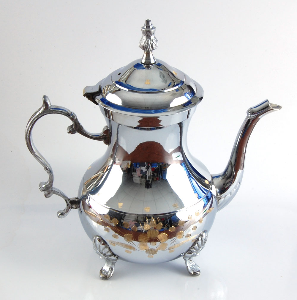 Théière chromée de très bel aspect reluisant, avec ciselures décoratives dorées sur les cotés. Fabriquée en Inde.