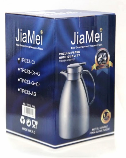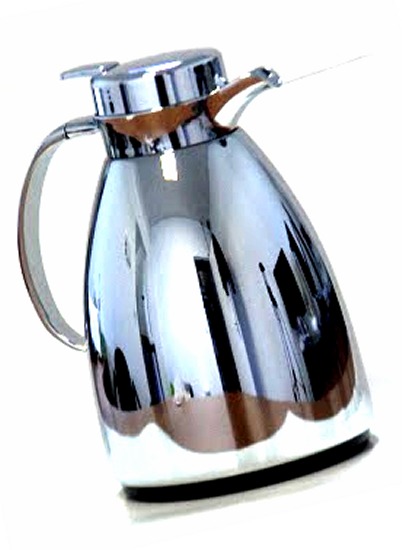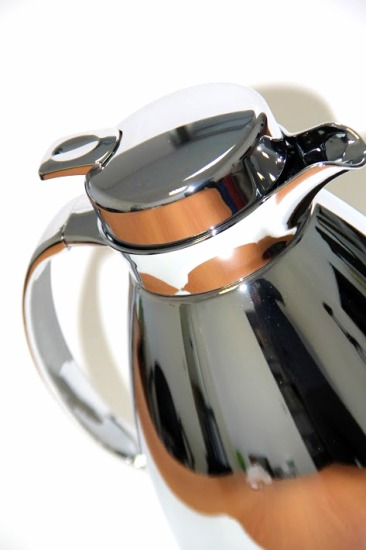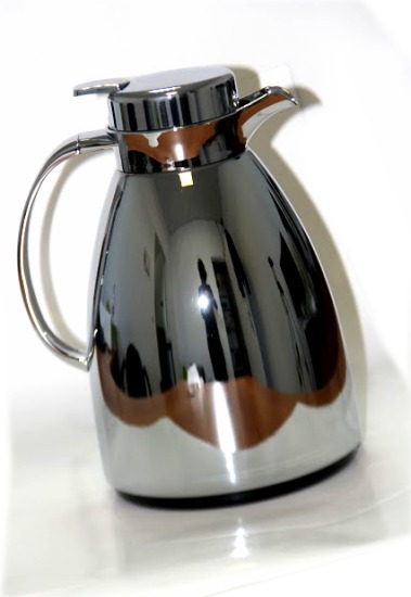 Thermos métallique pour thé et café, chromé avec parties dorées. Capacité : un litre.