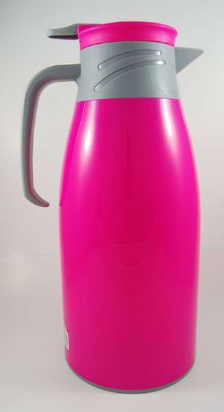 Thermos en plastique rose de capacité de 1,9L. le couvercle dispose d'un bouton à pression pour ouvrir le bec verseur afin de verser de la boisson, puis une fois le bouton relâché le bec verseur est à nouveau fermé, et la boisson reste isolée à la même température (quelle soit chaude ou froide).