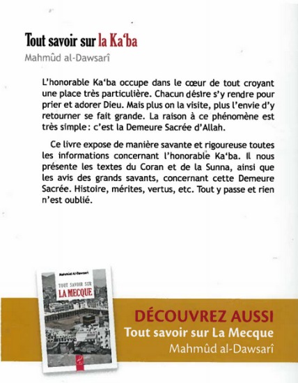 Cet ouvrage distille de façon savante et rigoureuse toutes les informations(histoire,mérites,vertus etc...) concernant l'honorable Ka'ba et ce,sans rien omettre. Il nous présente les textes du Coran et de la Sunna, ainsi que les avis des grands savants, concernant cette Demeure Sacrée.