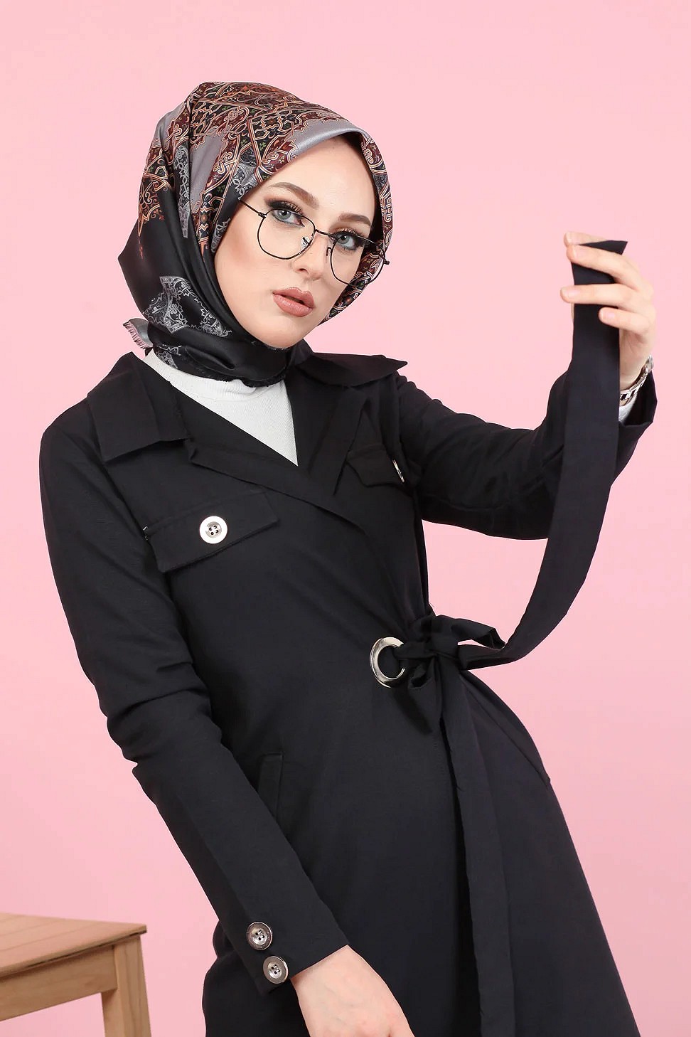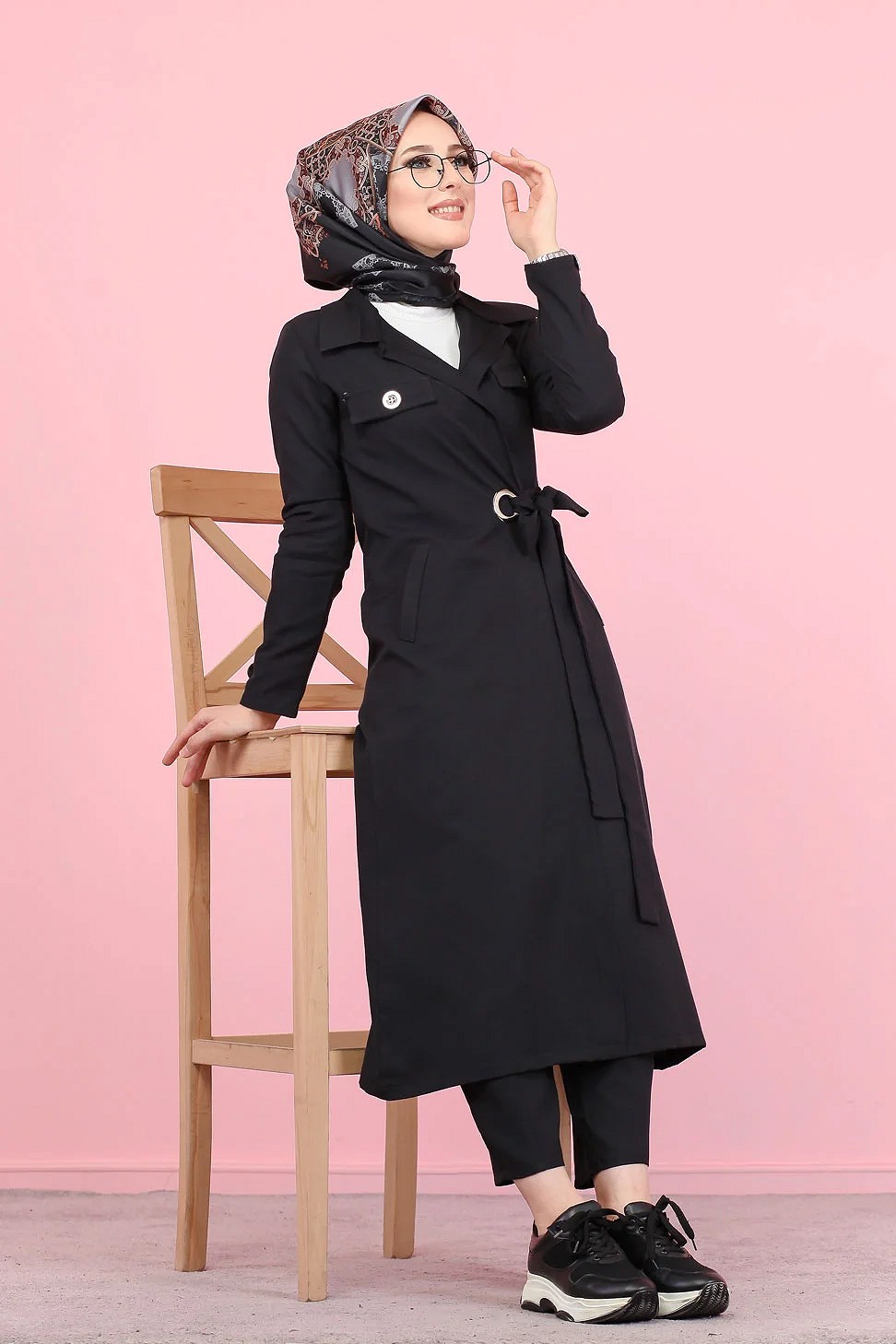 Veste Manteau femme avec ceinture intégrée (Tunique Automne Hiver - Boutique Vêtement Hijab Turque en ligne) - Couleur noir et bordeaux - REF. 35327 (19.90 €)